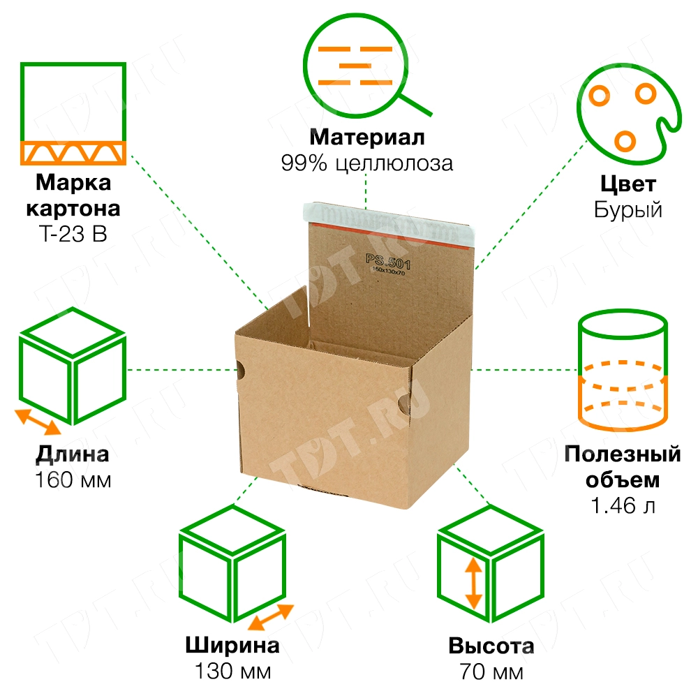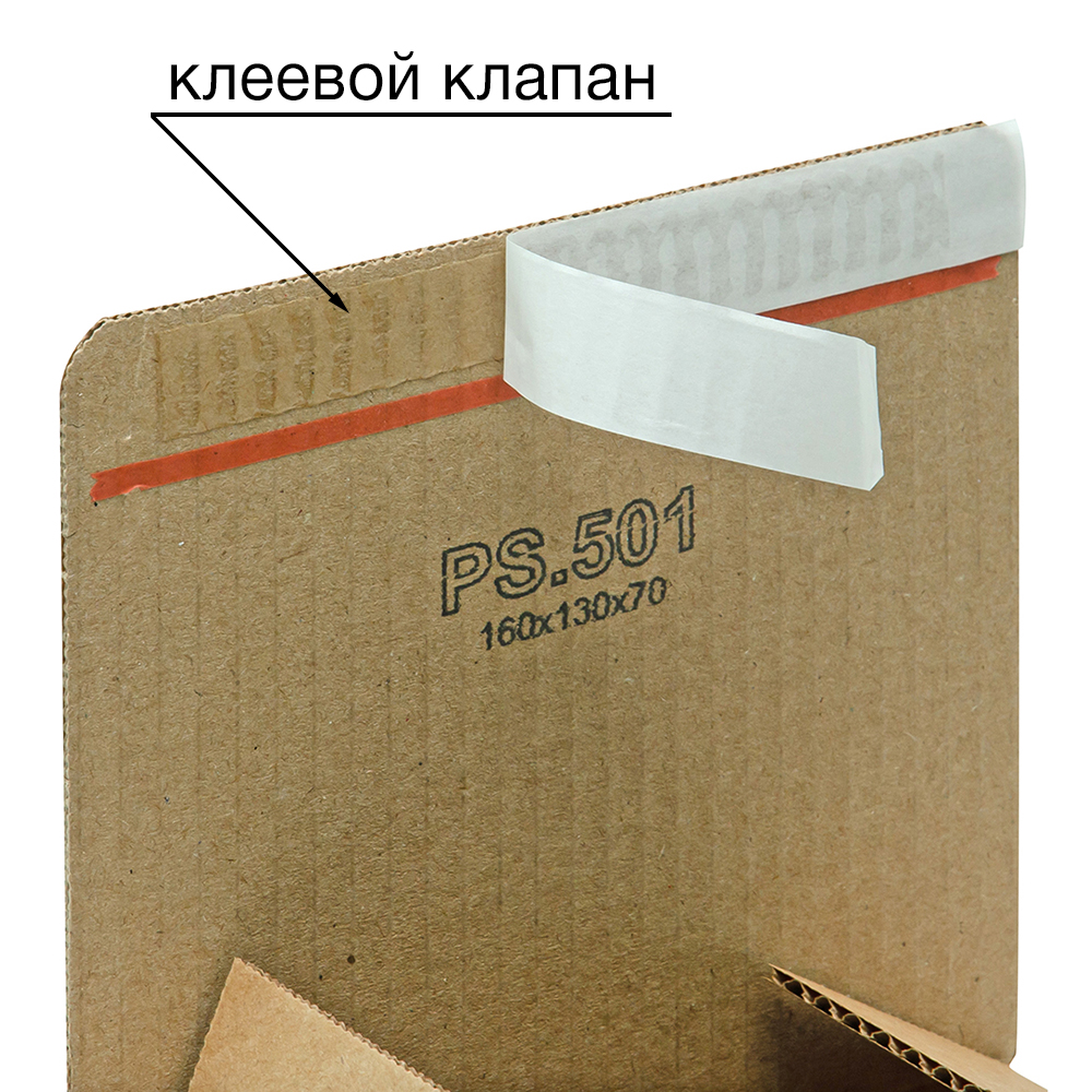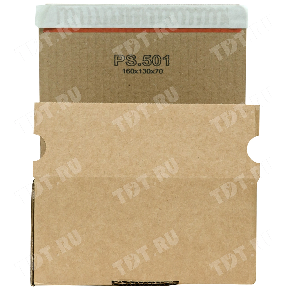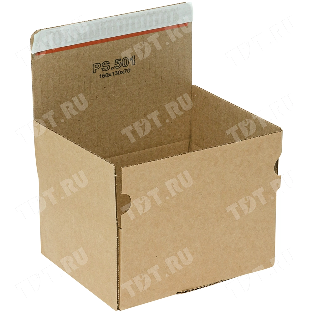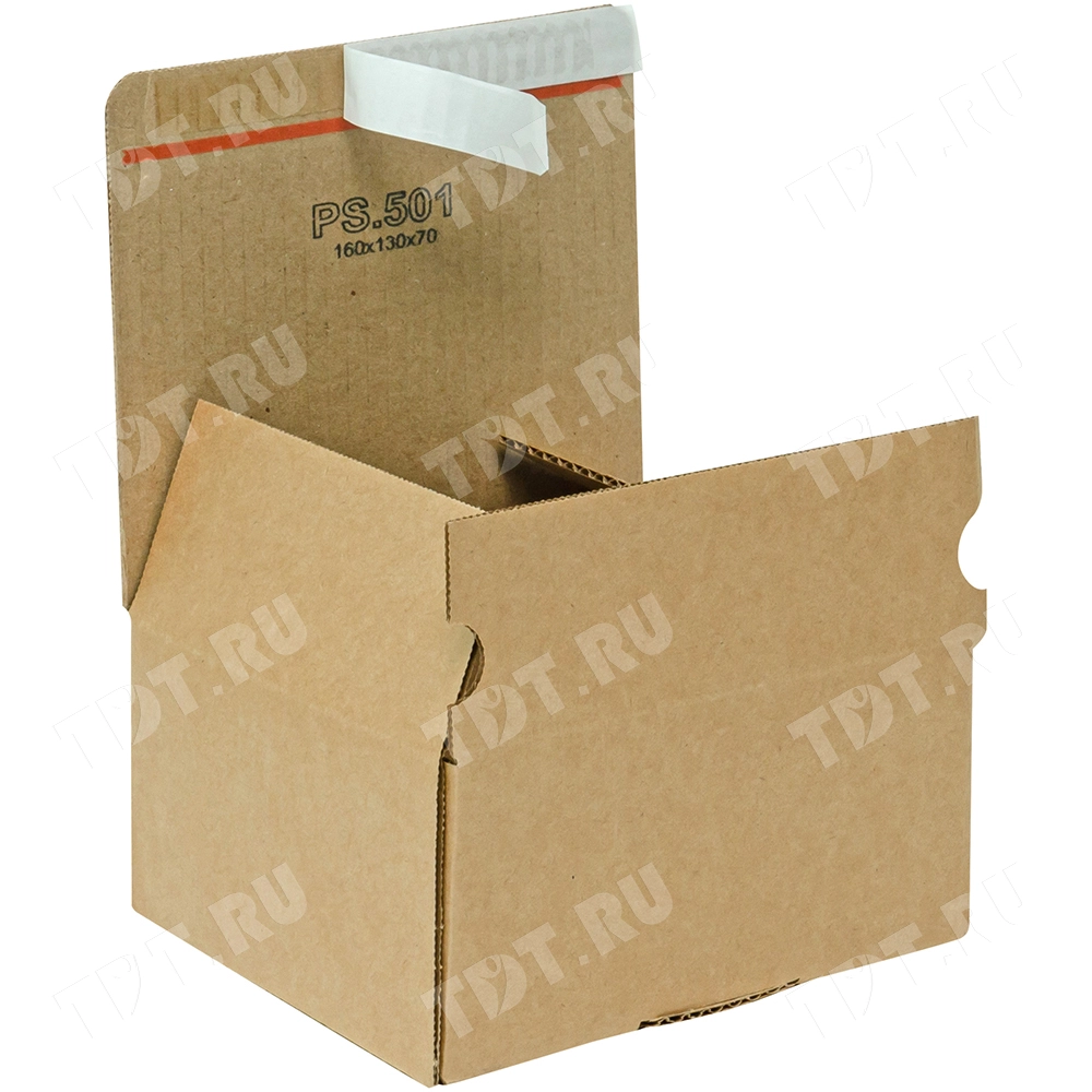 Почтовый короб PS.501 с клеевым клапаном, бурого цвета, длиной 160 мм, шириной 130 мм и высотой 70 мм. Изготовлен из трёхслойного гофрокартона Т-23 В. Полезный объём — 1.46 л.