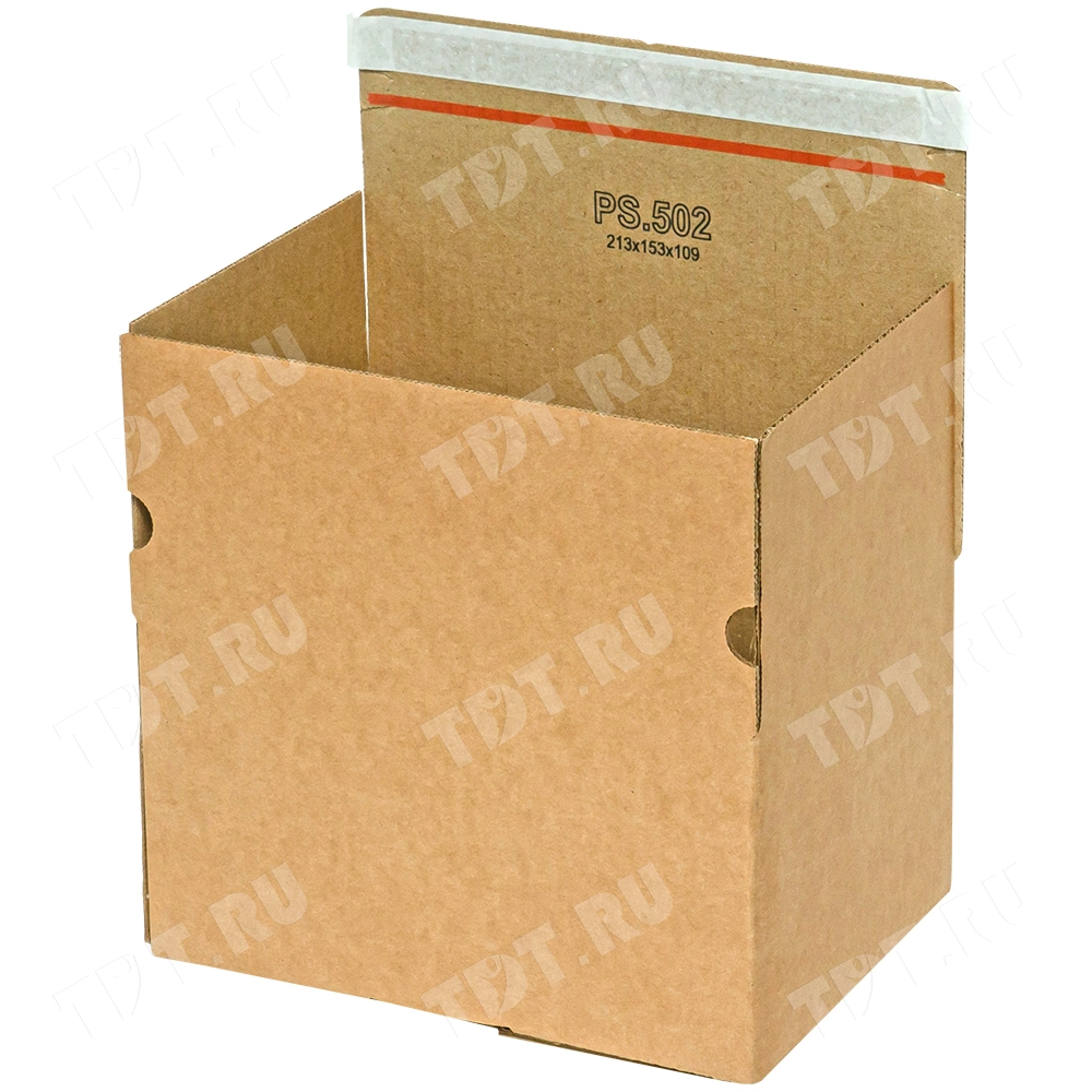 Почтовый короб PS.502 с клеевым клапаном, бурого цвета, длиной 231 мм, шириной 153 мм и высотой 109 мм. Изготовлен из трёхслойного гофрокартона Т-23 В. Полезный объём — 3.55 л.