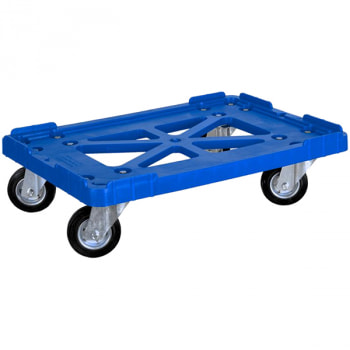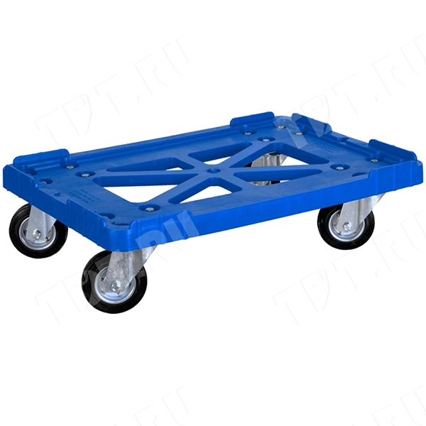 Синяя четырехколесная тележка для транспортировки пластиковых ящиков по складу, по торговым залам и производственным цехам длиной 625 мм, шириной 420 мм, высотой 175 мм. Максимально допустимы размер ящиков 600*400 мм. Грузоподъемность составляет 200 кг. Платформа установлена на высококачественных резиновых колёсах, не портящих напольное покрытие. Изготовлена из металла, резины и полиэтилена. Производится в России.
