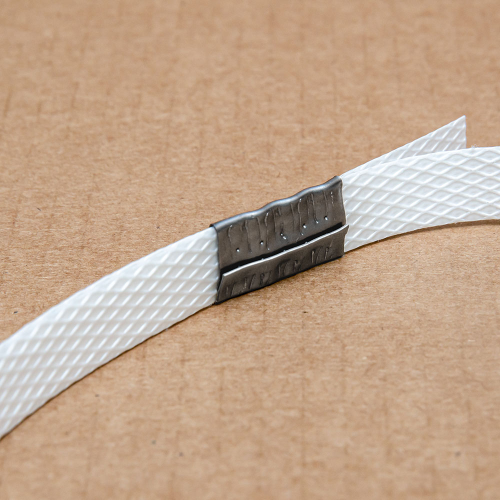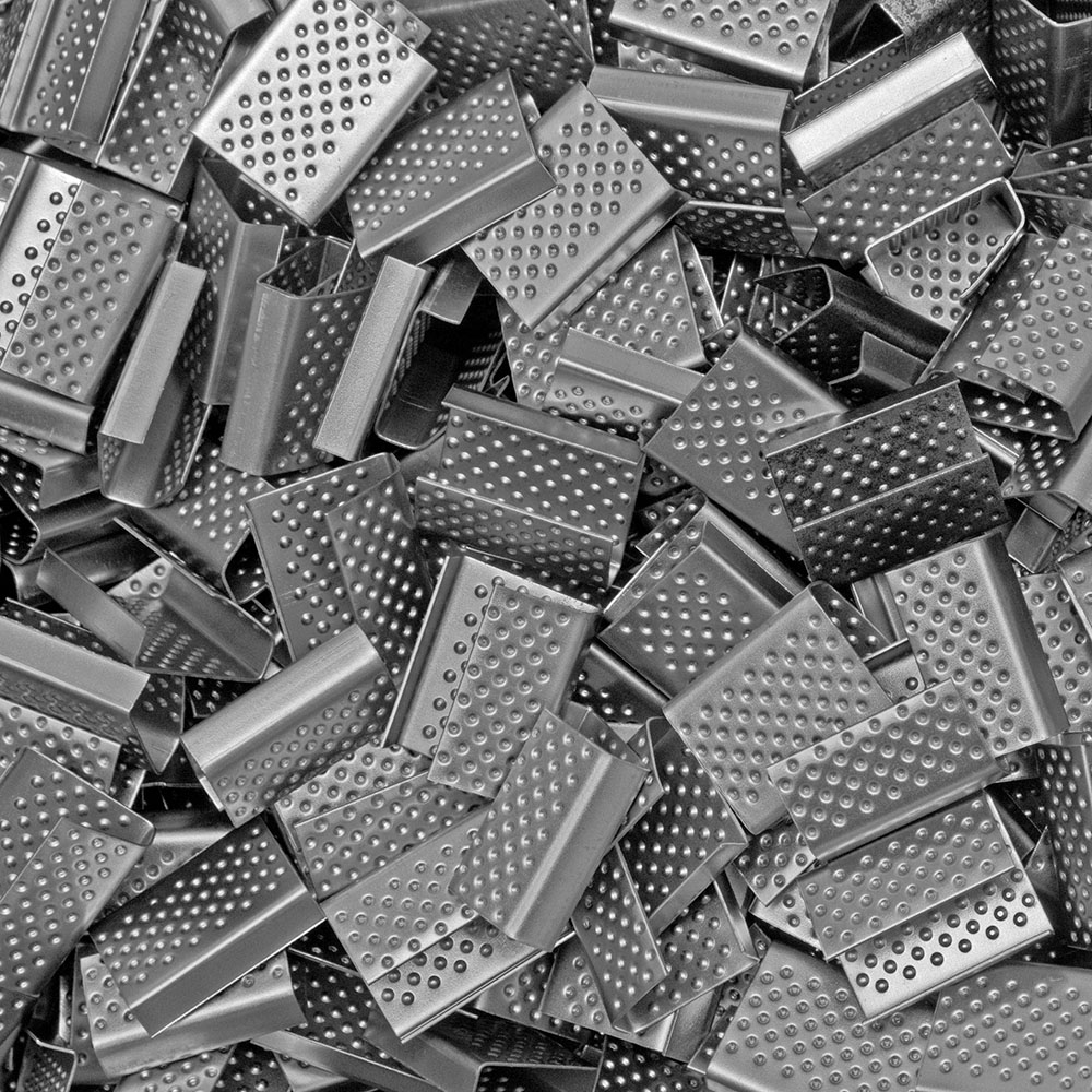 Металлические оцинкованные скобы для полипропиленовых лент (ПП), шириной 19 мм, толщиной 0.5 мм, в упаковке по 1000 шт, весом 5 кг, транспортировочным объемом 0.006348 м³. Скобы подходят для лент шириной 19 мм. Производятся в России.