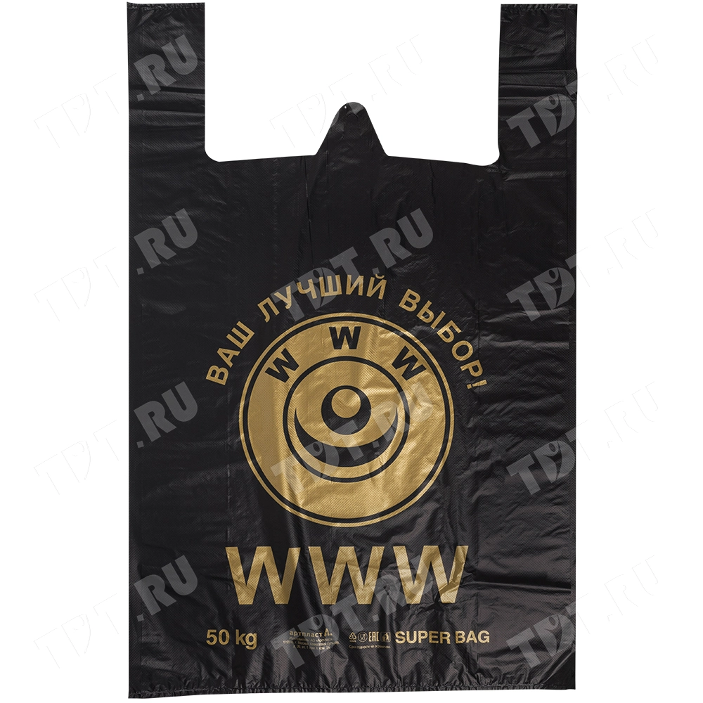 Полиэтиленовые пакеты майка ПНД «WWW» с надписями, черного цвета, длиной 69 см, шириной 43+20 см, толщиной 33 мкм, в упаковке 50 штук. Материал – полиэтилен низкого давления. Производятся в России.