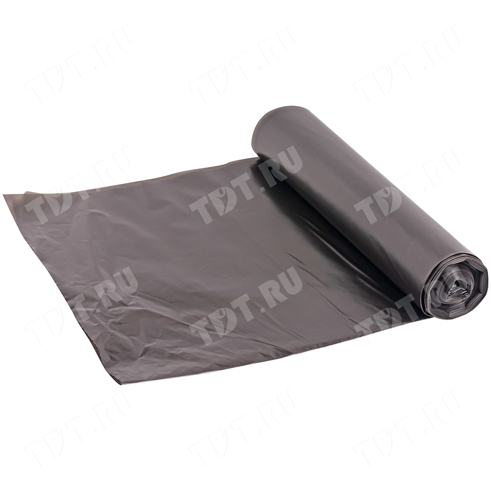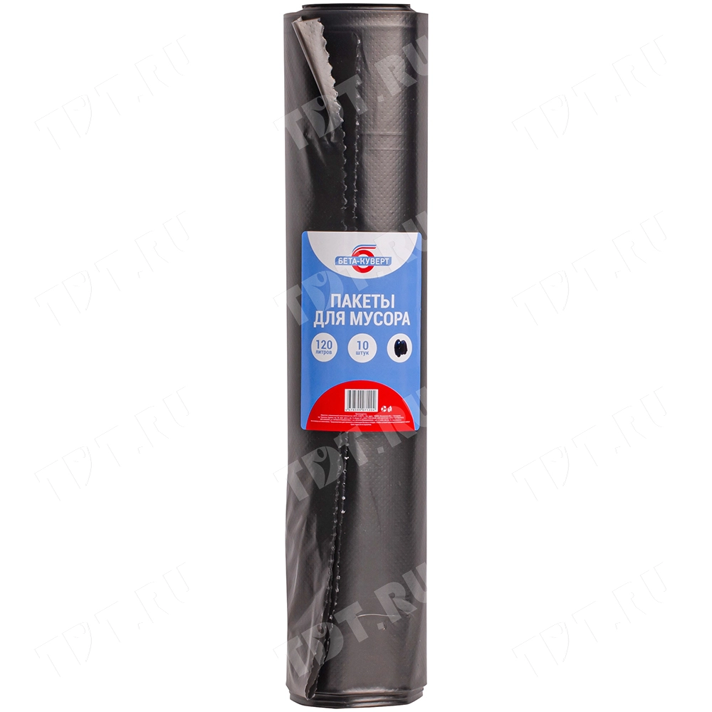 Пакеты для мусора Бета-Куверт повышенной прочности, черного цвета, объемом 120 л, длиной 120 см, шириной 60 см, толщиной 49 мкм, в упаковке по 10 штук. Изготовлены из полиэтилена среднего давления (ПСД). Производятся в России.