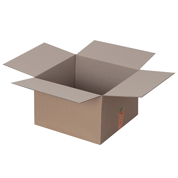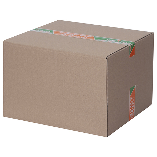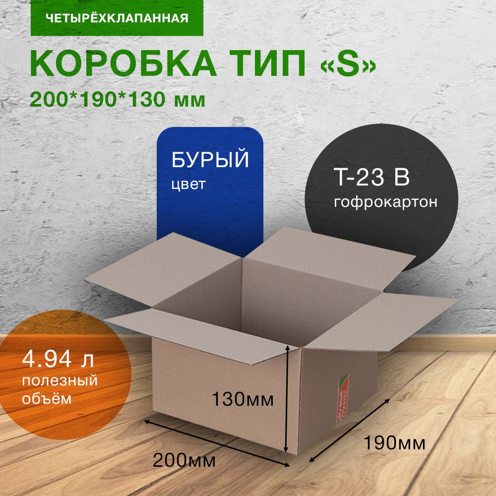 Картонный короб СДЭК тип «S» бурого цвета, длиной 200 мм, шириной 190 мм и высотой 130 мм. Изготовлен из трехслойного картона марки Т-23 В. Полезный объём — 4.94 л.