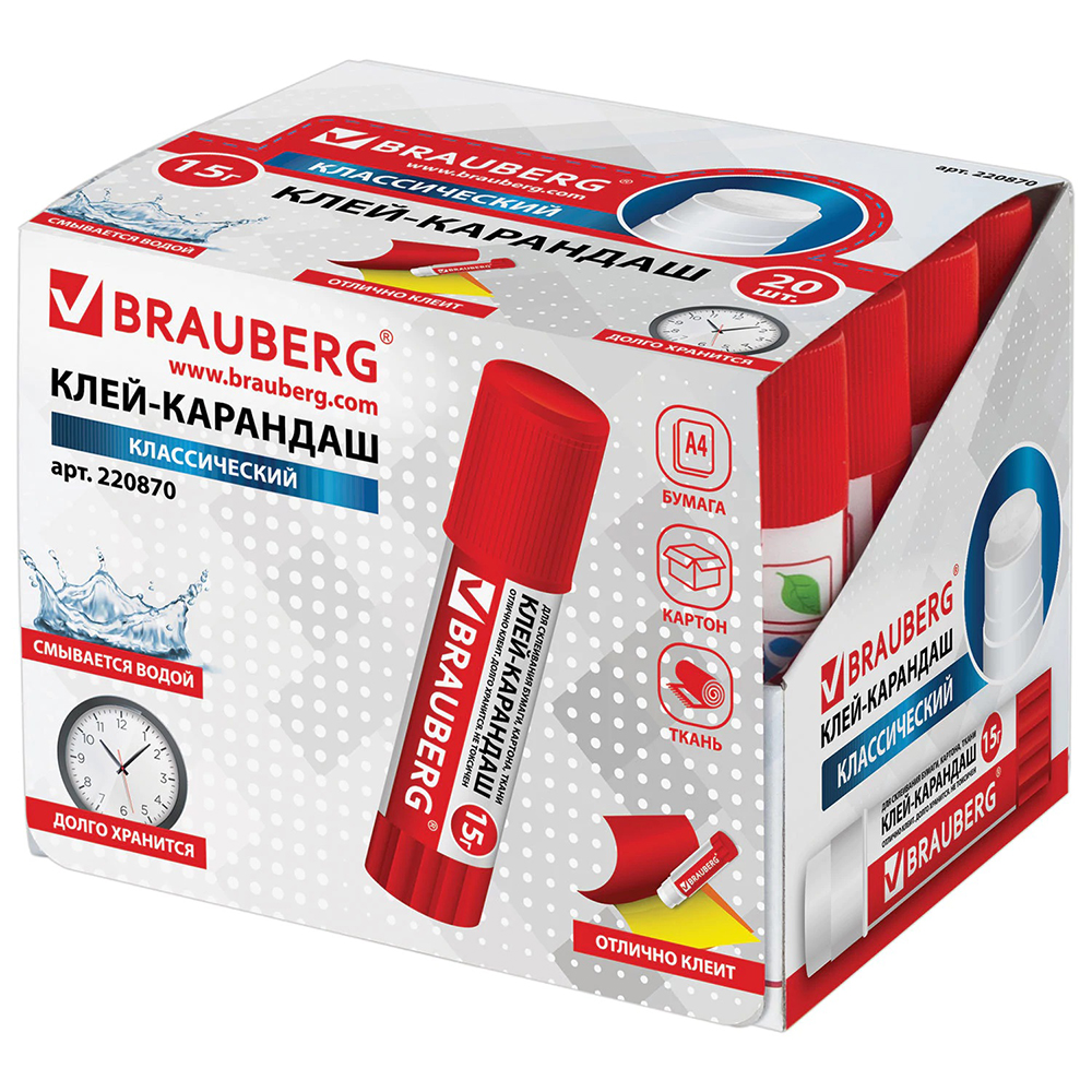 Клей-карандаш BRAUBERG, код производителя 220870, белого цвета, объемом 15 г. Производится в Китае.