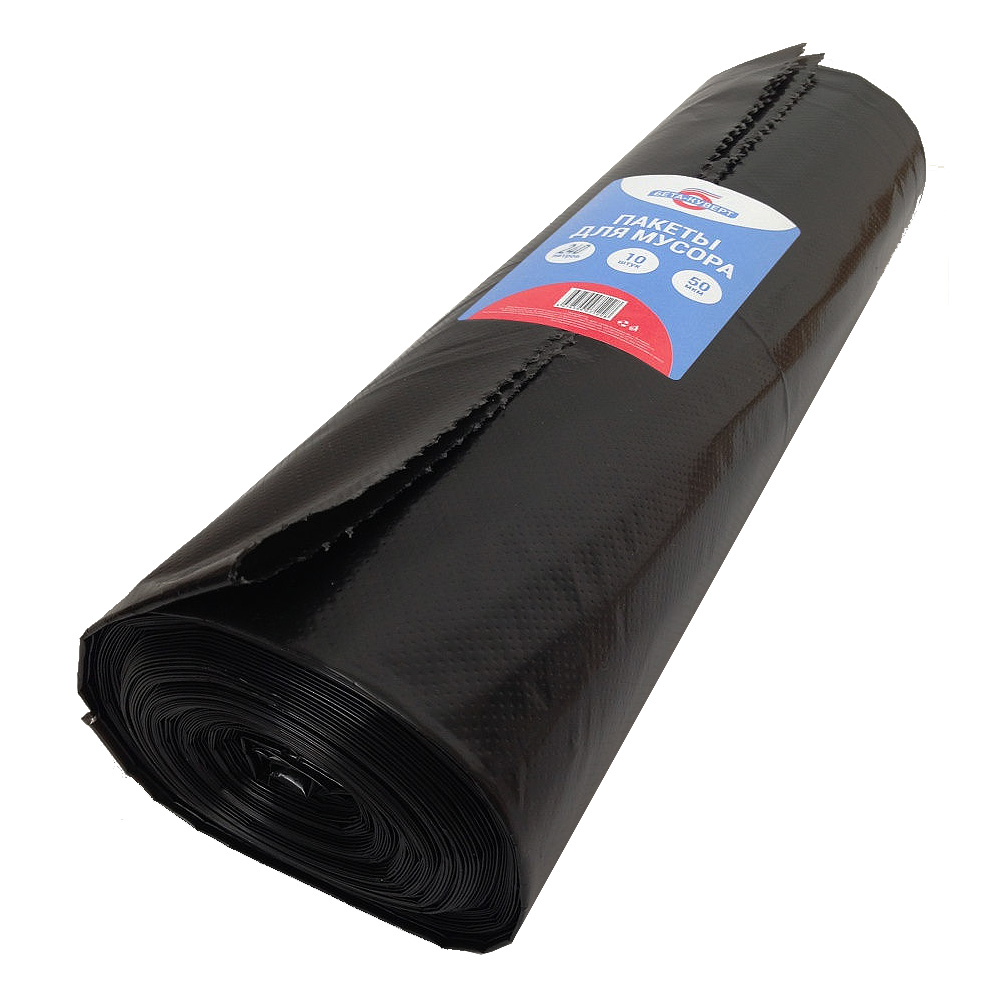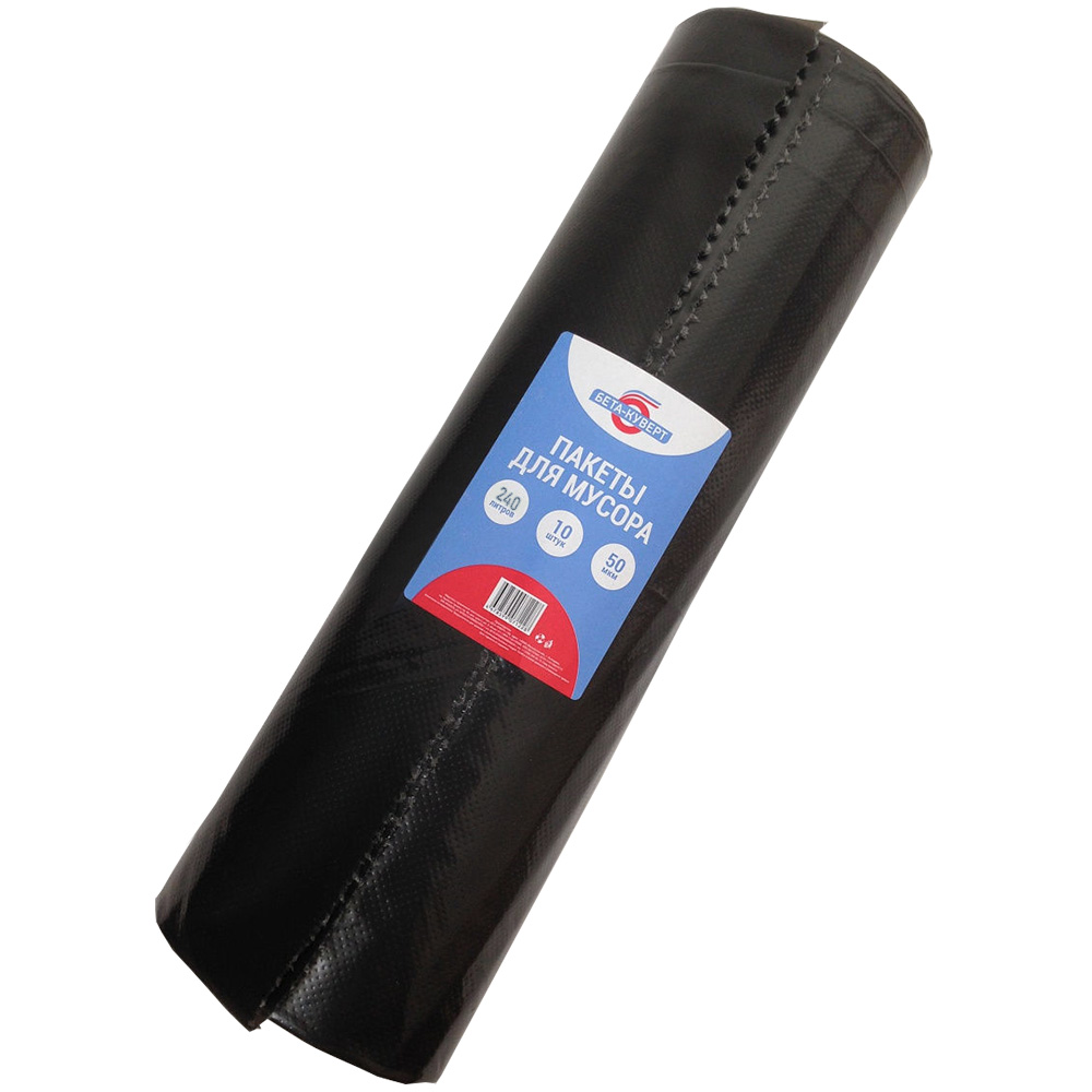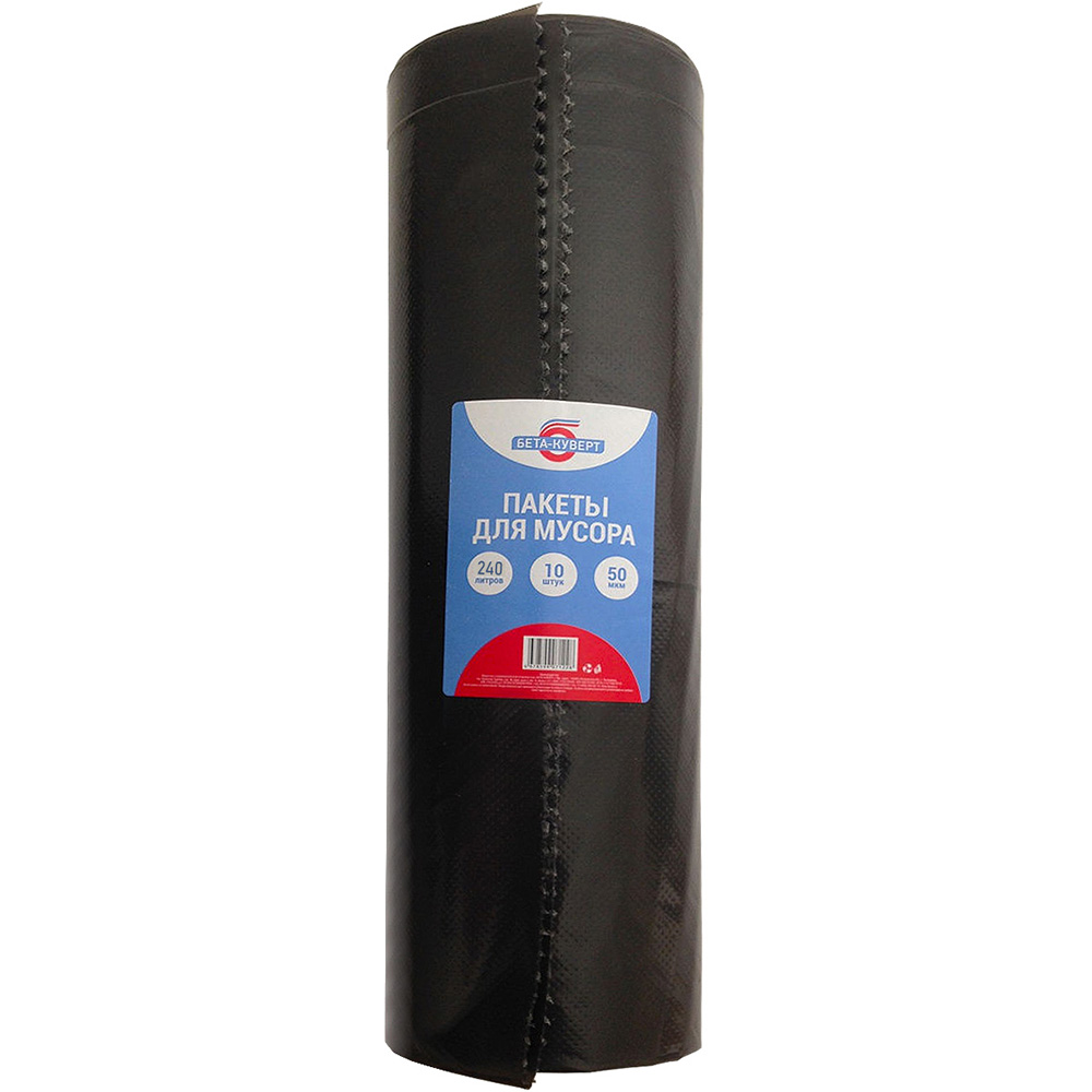 Пакеты для мусора Бета-Куверт повышенной прочности, черного цвета, объемом 240 л, длиной 140 см, шириной 90 см, толщиной 50 мкм, в упаковке по 10 штук. Изготовлены из полиэтилена среднего давления (ПСД). Производятся в России.
