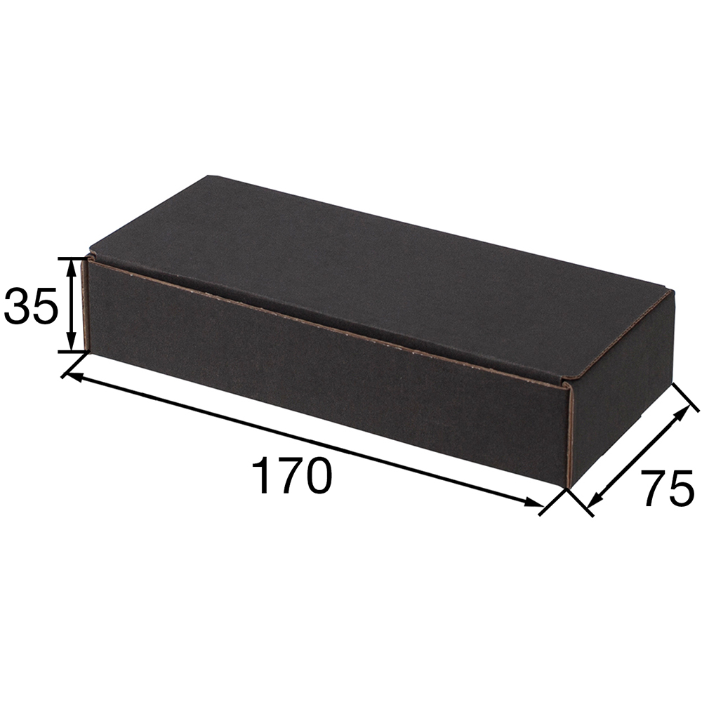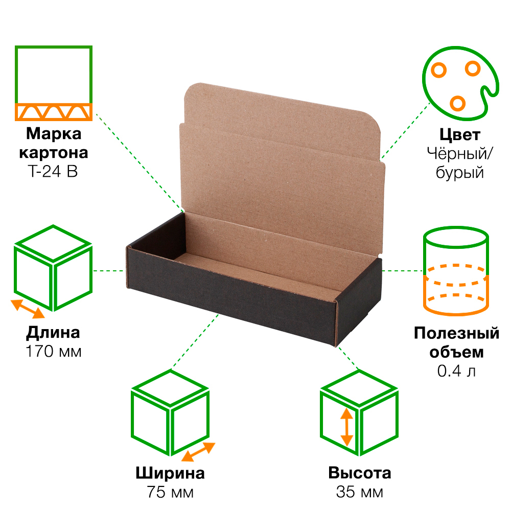Короб КС-515 МГФ, серии КС-500, чёрный, длиной 170 мм, шириной 75 мм и высотой 35 мм. Изготовлен из картона марки Т-24 В. Полезный объём — 0.4 л.