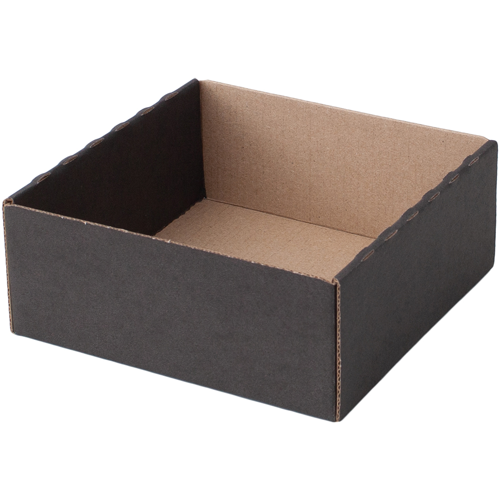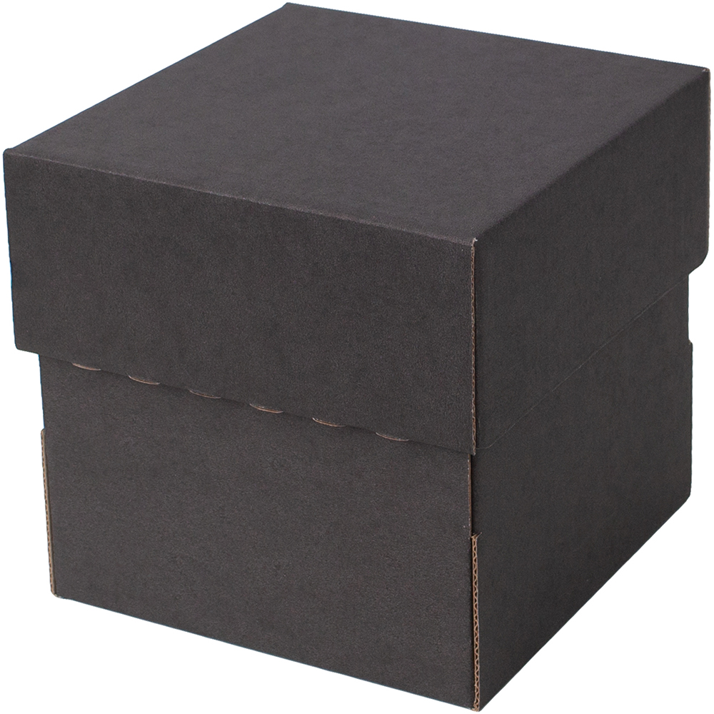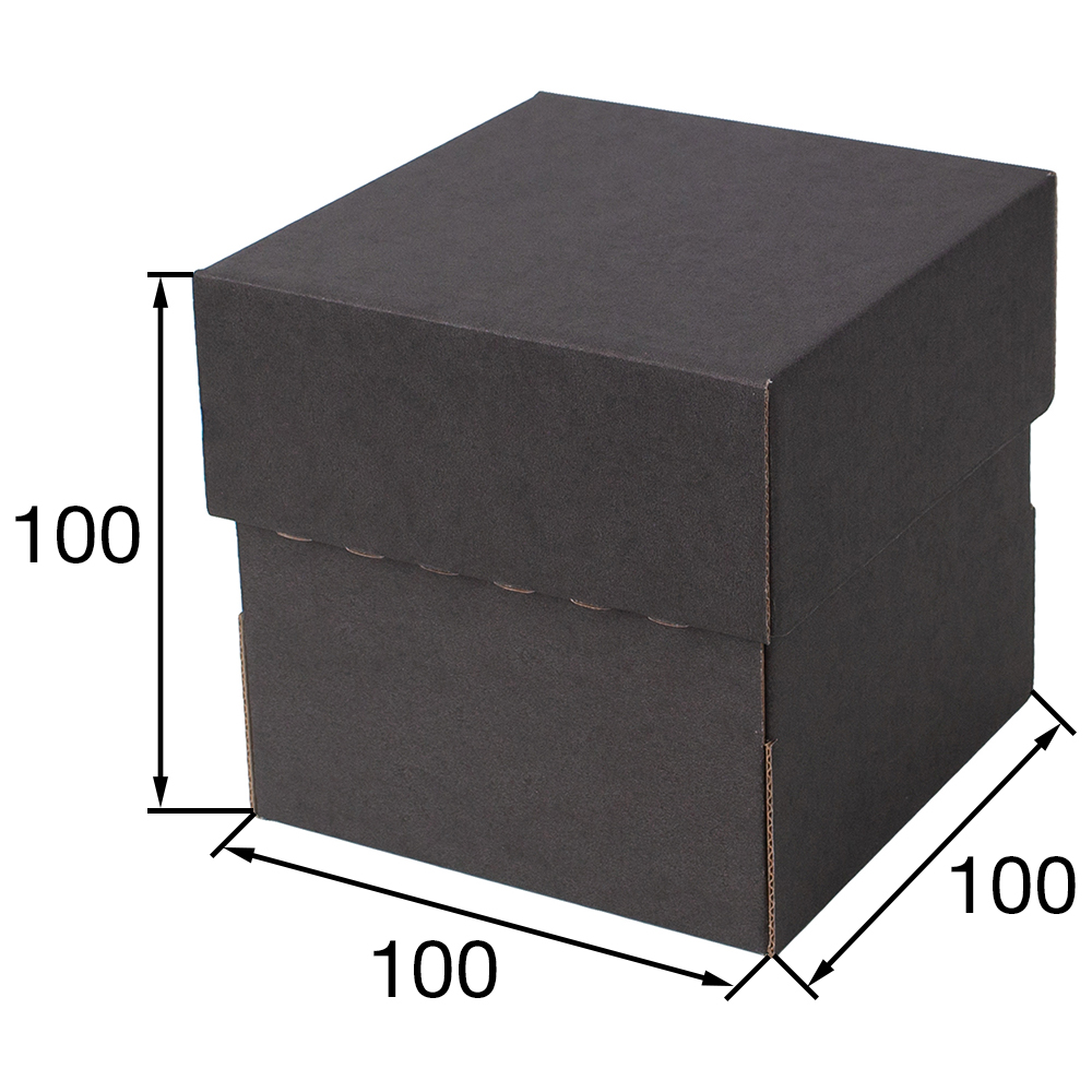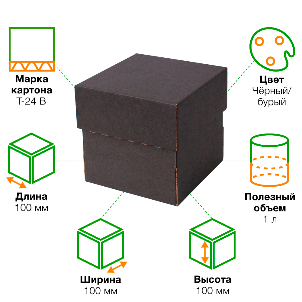 Коробка крышка-дно «Кубик» чёрного цвета, серия КС-500, длиной 100 мм, шириной 100 мм и высотой 100 мм. Изготовлена из картона марки Т-24 В. Полезный объём — 1 л.