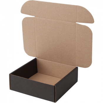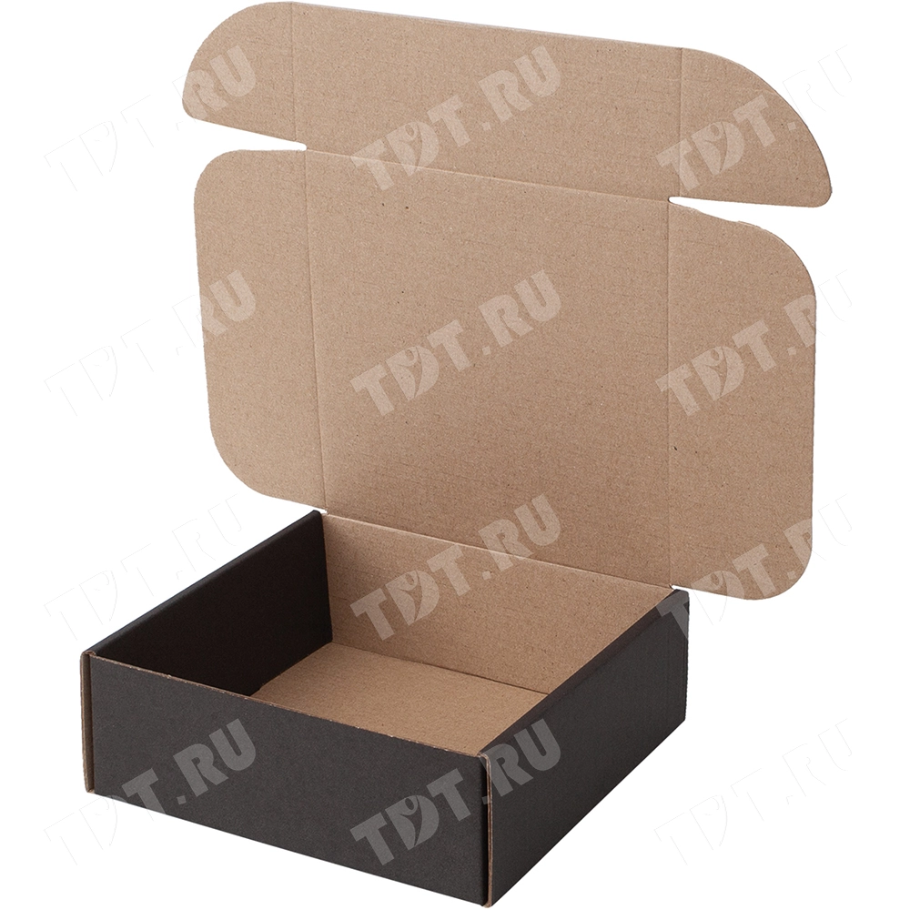 Короб КС-521 МГФ, серии КС-500, чёрный, длиной 150 мм, шириной 150 мм и высотой 55 мм. Изготовлен из картона марки Т-24 В. Полезный объём — 1.2 л.
