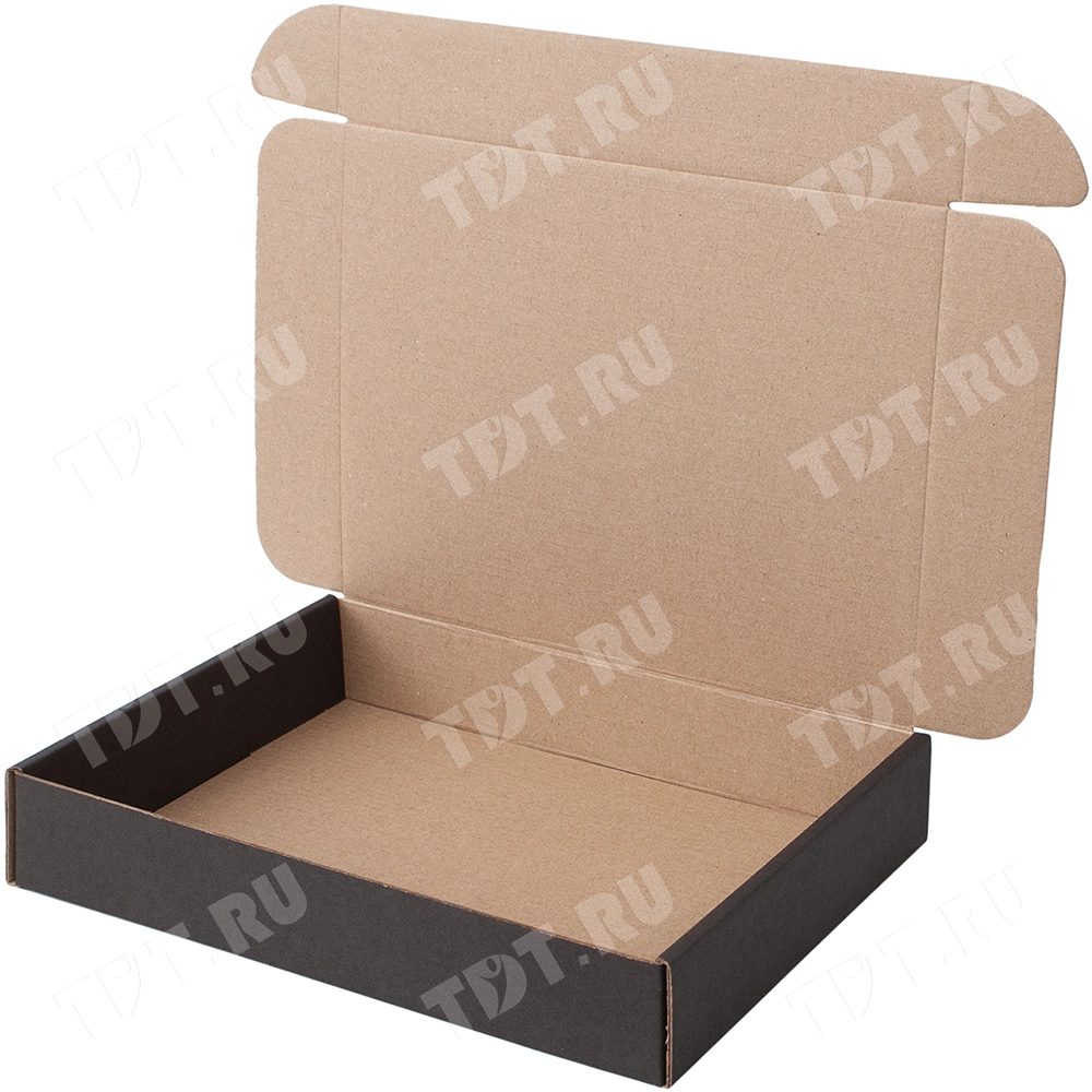 Короб КС-529 МГФ, серии КС-500, чёрный, длиной 230 мм, шириной 180 мм и высотой 40 мм. Изготовлен из картона марки Т-24 В. Полезный объём — 1.6 л.