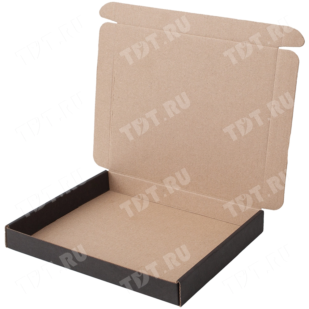 Короб КС-535 МГФ, серии КС-500, чёрный, длиной 210 мм, шириной 185 мм и высотой 25 мм. Изготовлен из картона марки Т-24 В. Полезный объём — 0.95 л.