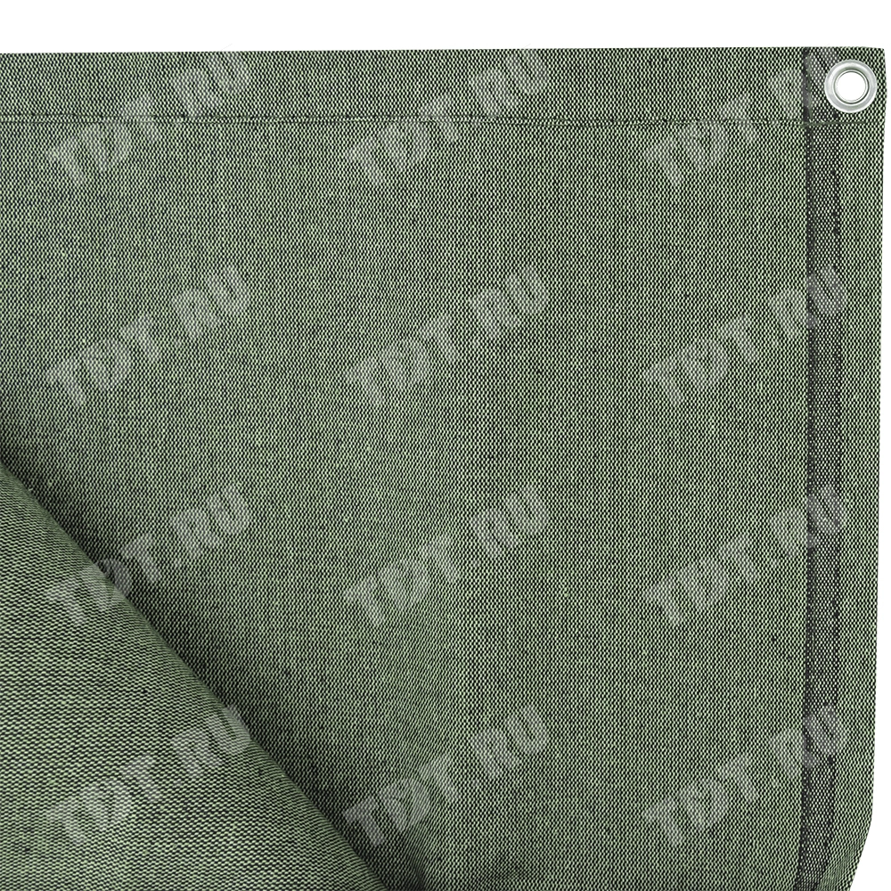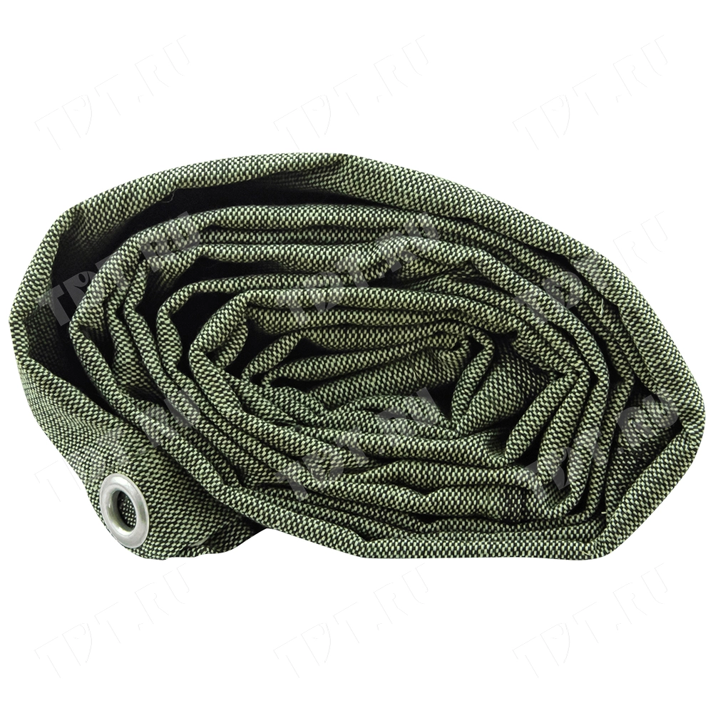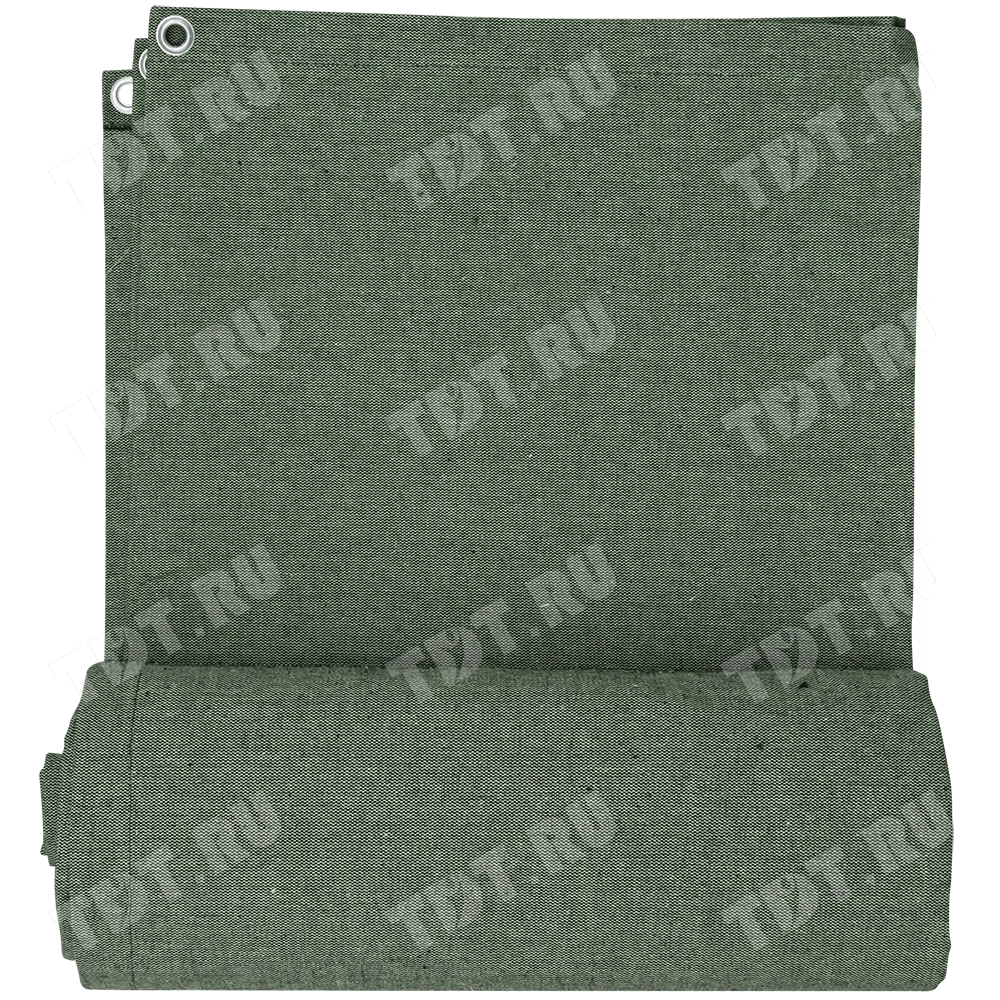Огнеупорный брезент с люверсами Rendell, цвета хаки, длиной 4 м, шириной 3 м, площадью 12 м², плотностью 400 г/м², расстоянием между люверсами 50 см, весом 4.8 кг. Материал – хлопок, лен и огнеупорная пропитка (ОП). Производится в России.