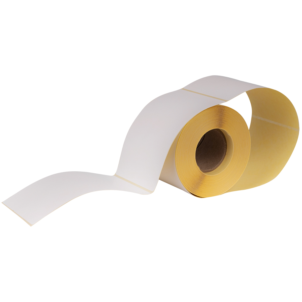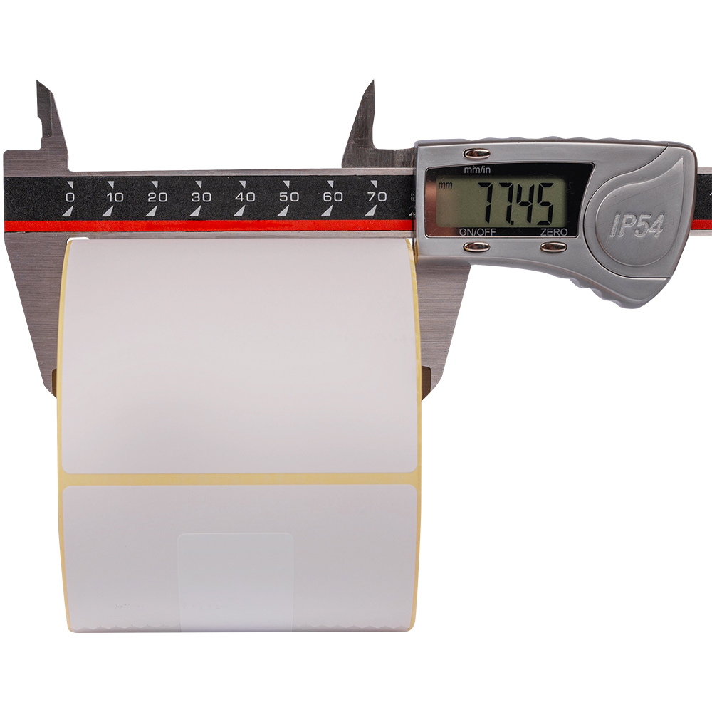 Самоклеящиеся этикетки ЭКО из матовой бумаги белого цвета, шириной 75 мм, высотой 120 мм, диаметром втулки 40 мм, количеством в рулоне по 300 штук. Производятся в России. Термоэтикетки ЭКО в рулонах предназначены для печати на принтерах без риббона. На этикетках есть специальный слой, который при нагреве термоголовки принтера темнеет, за счет этого происходит печать.