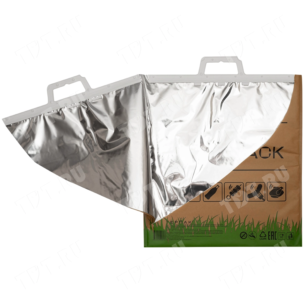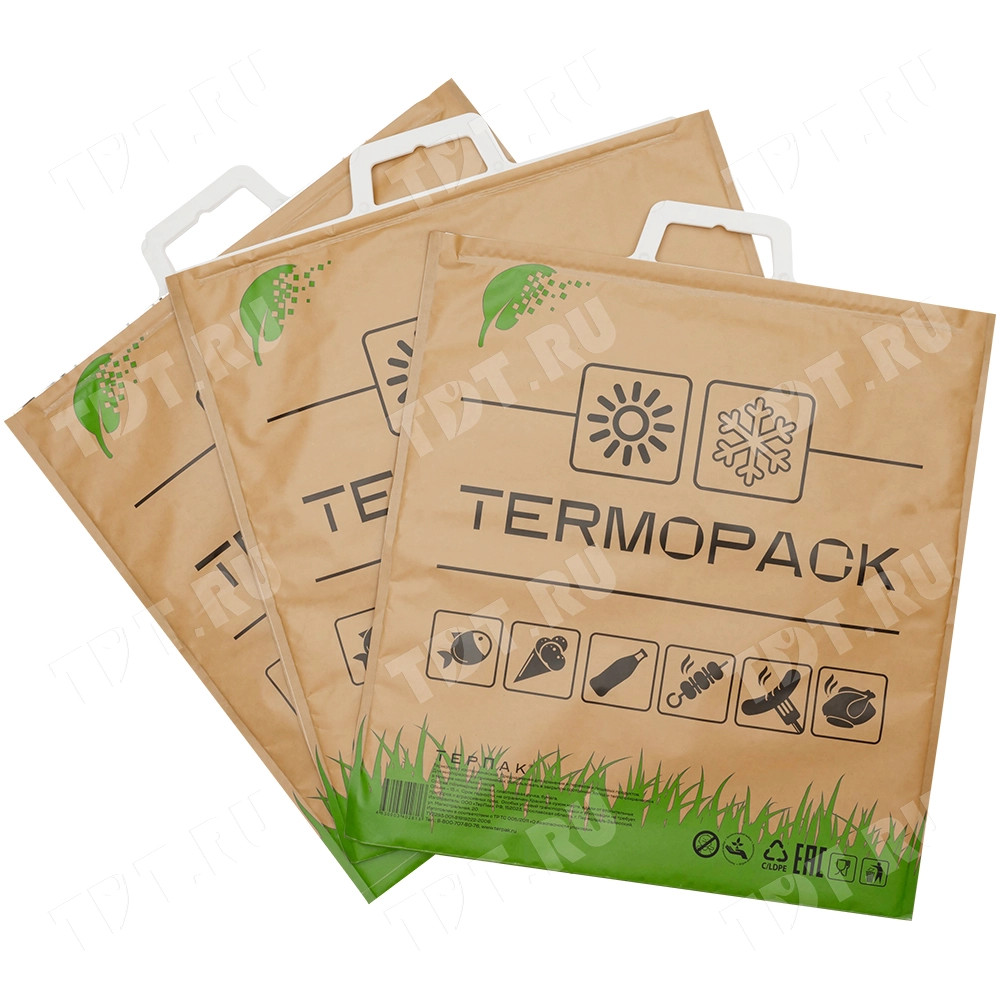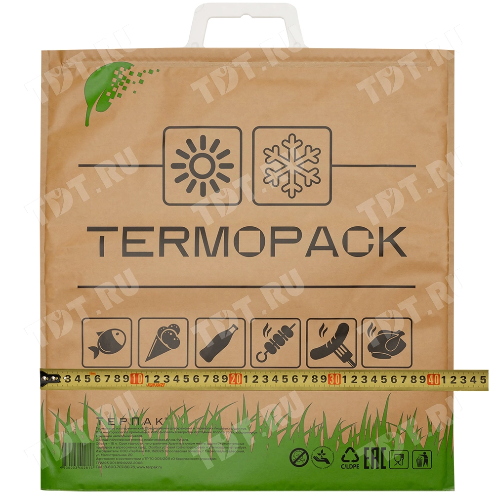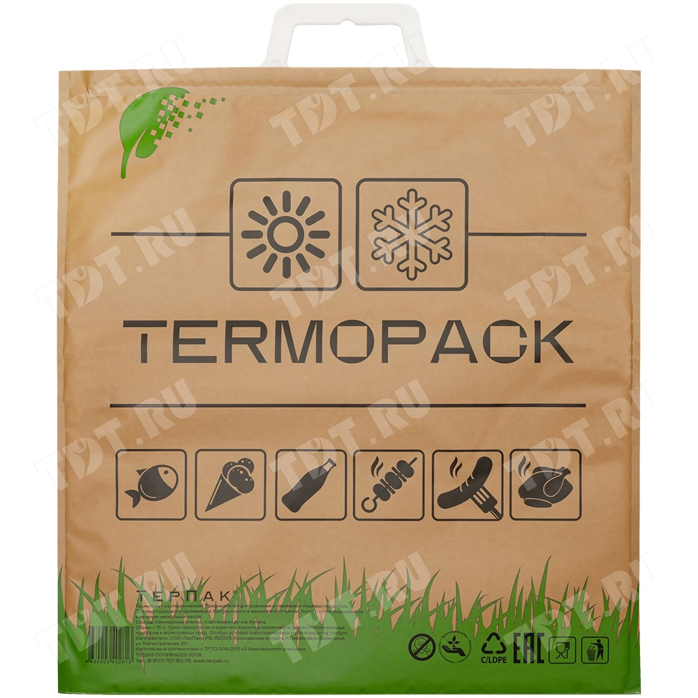 Крафт термопакет для пищевых продуктов Терпак, шириной 420 мм, высотой 450 мм, объемом 15 л, грузоподъемностью до 7 кг. Многоразовый термопакет сохраняет холод до 6 часов. Производится в России.