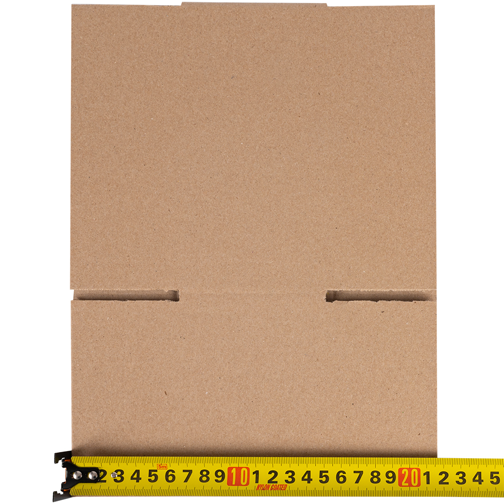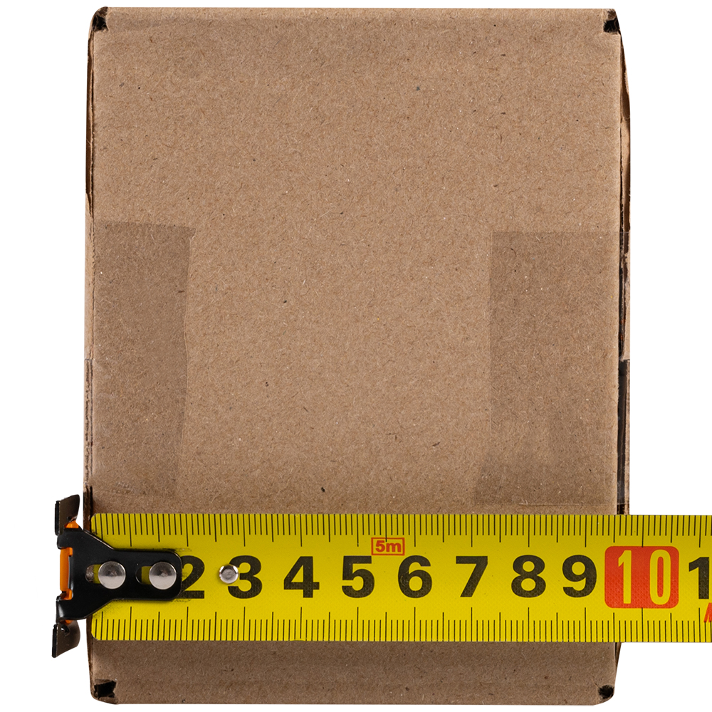 Картонный короб СДЭК тип «XS» бурого цвета, длиной 170 мм, шириной 120 мм и высотой 90 мм. Изготовлен из трехслойного картона марки Т-21 В. Полезный объём — 1.84 л.