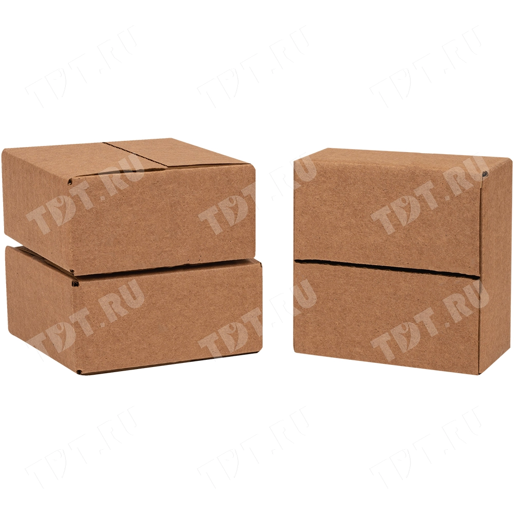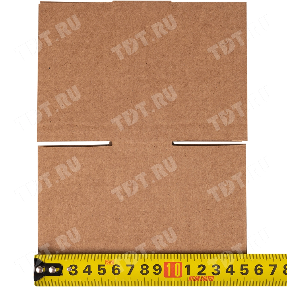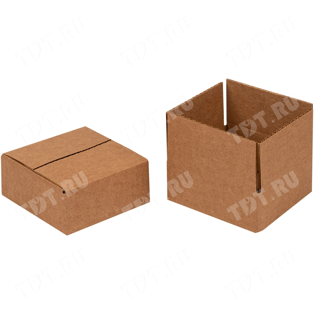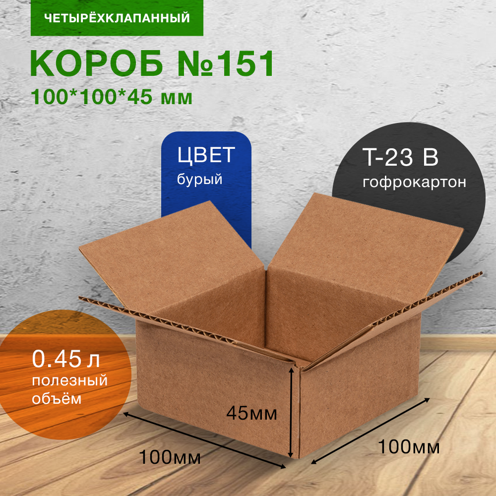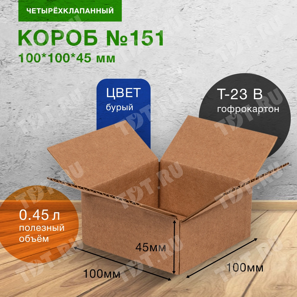Картонный короб №151, длиной 100 мм, шириной 100 мм и высотой 45 мм. Изготовлен из трехслойного картона марки Т-23 В (целлюлоза). Полезный объём — 0.45 л.