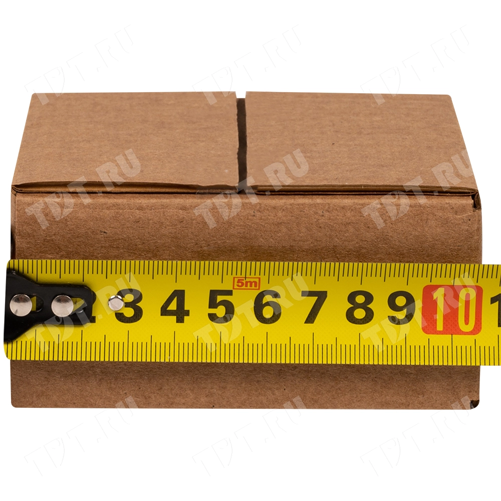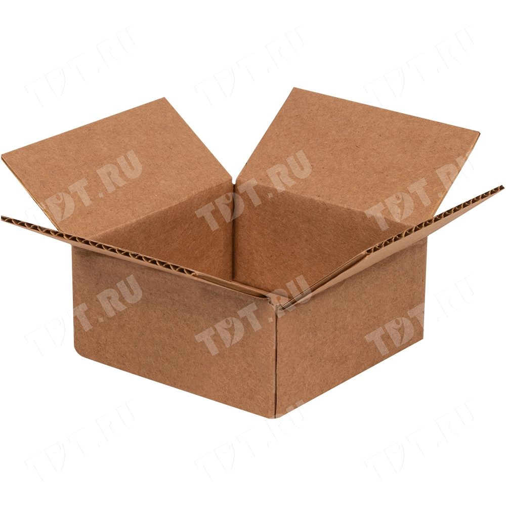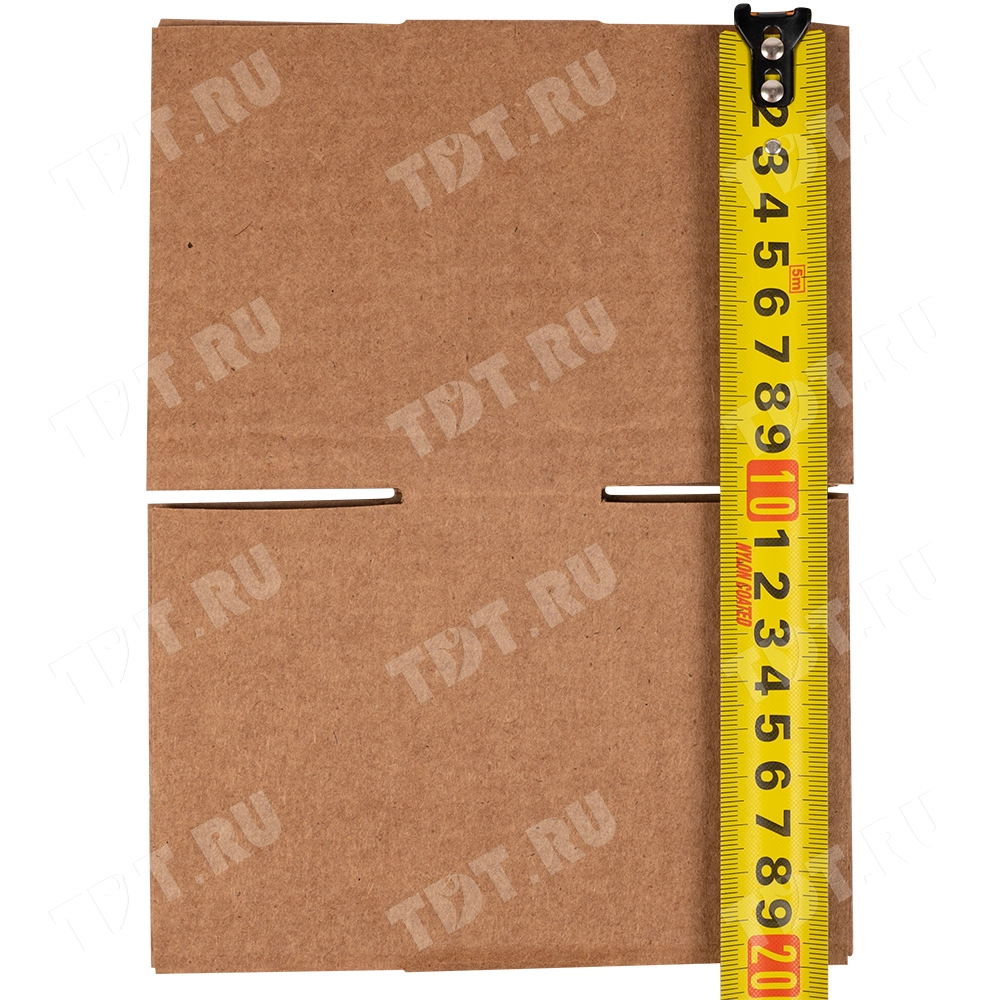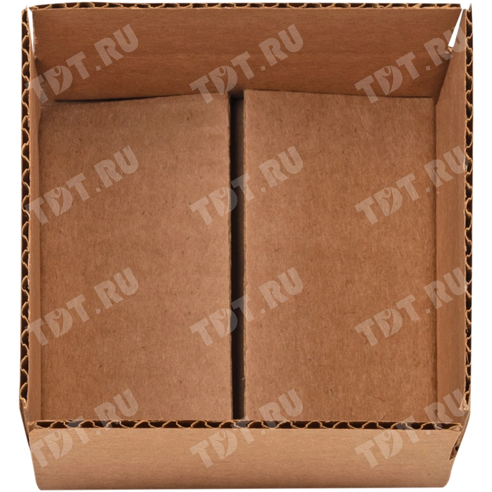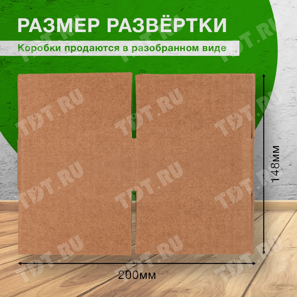 Картонный короб №151, длиной 100 мм, шириной 100 мм и высотой 45 мм. Изготовлен из трехслойного картона марки Т-23 В (целлюлоза). Полезный объём — 0.45 л.