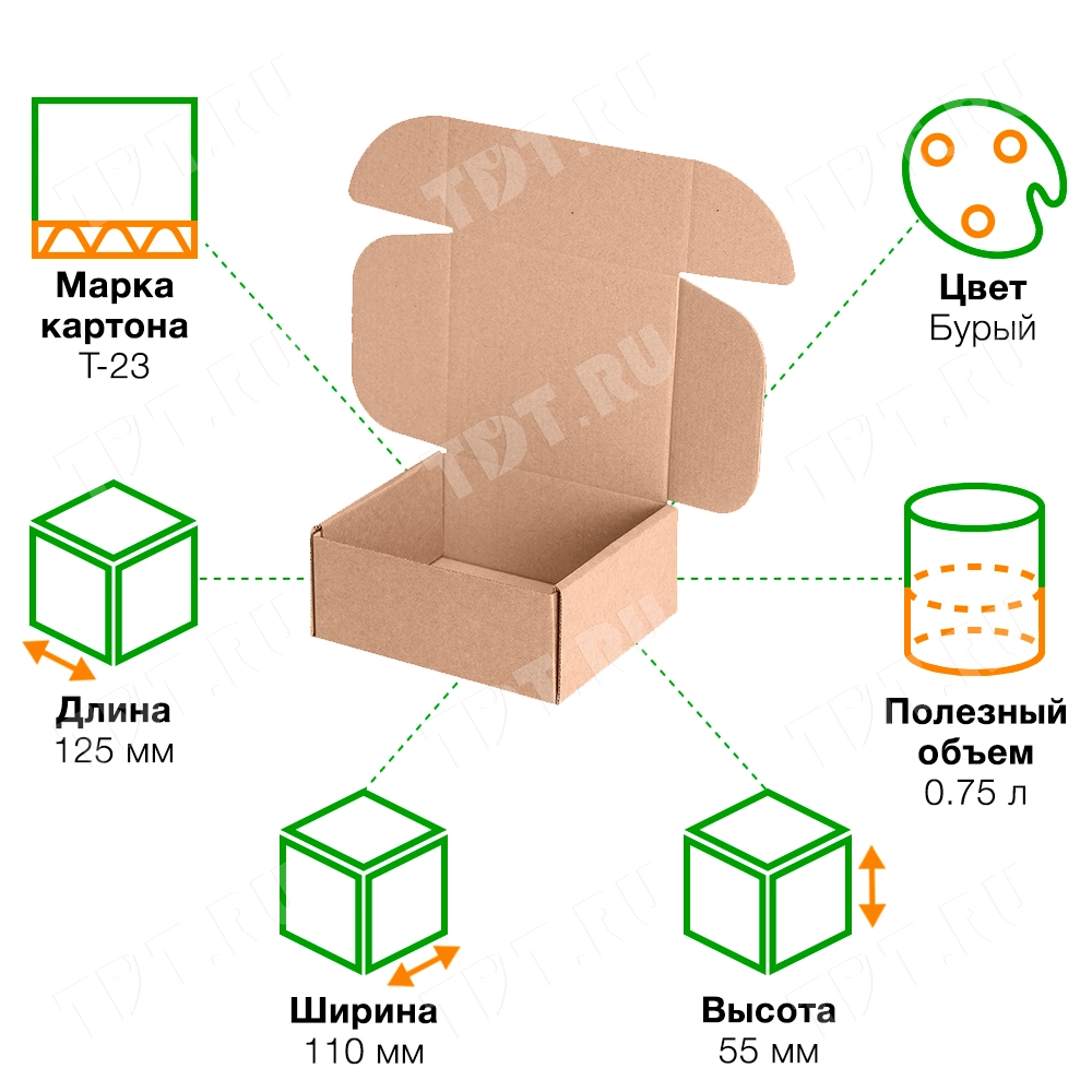 Короб КС-607 МГК, серии КС-600, красный, длиной 125 мм, шириной 110 мм и высотой 55 мм. Изготовлен из микрогофрокартона Т-23. Полезный объём — 0.75 л.