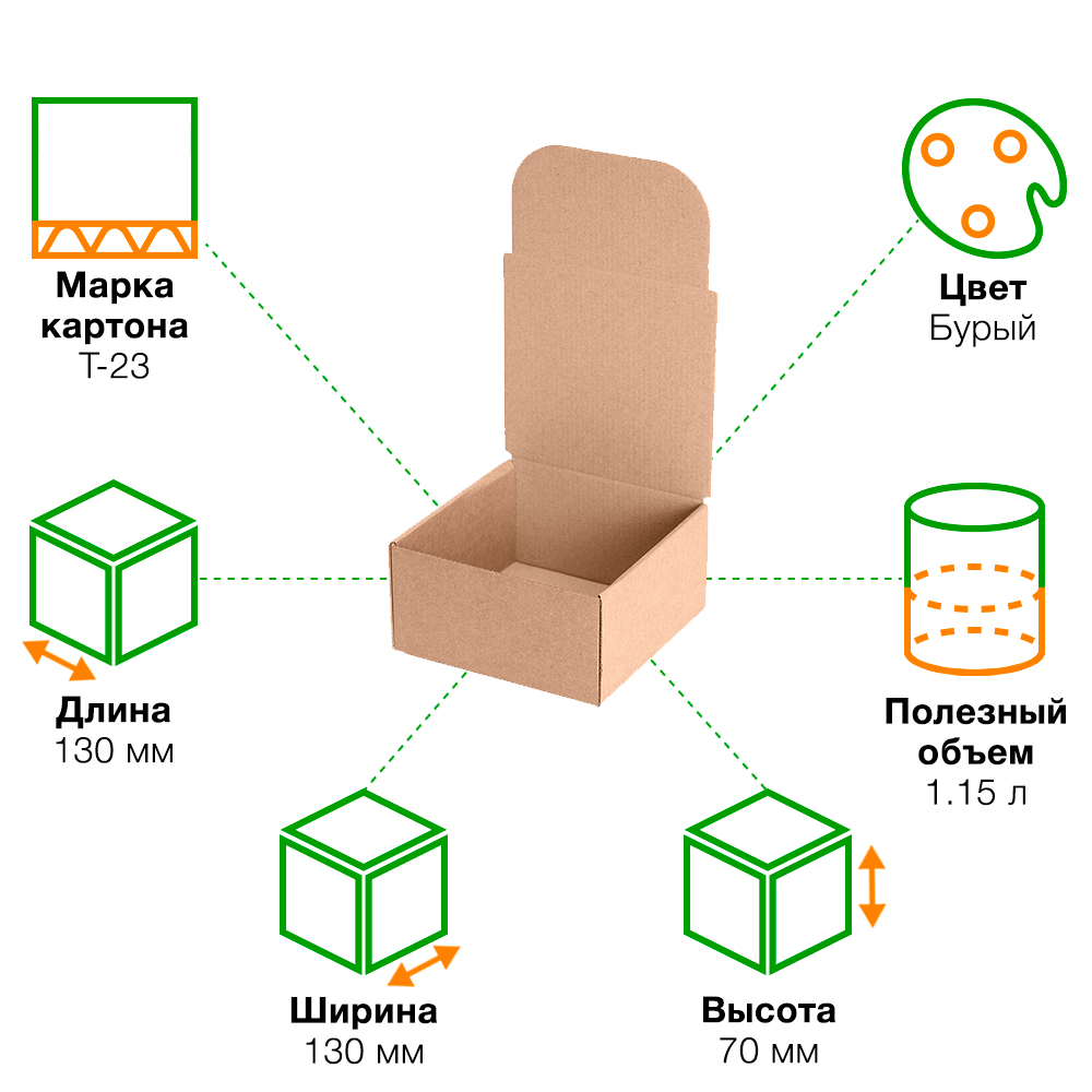 Короб КС-610 МГК, серии КС-600, бурый, длиной 130 мм, шириной 130 мм и высотой 70 мм. Изготовлен из микрогофрокартона Т-23. Полезный объём — 1.15 л.