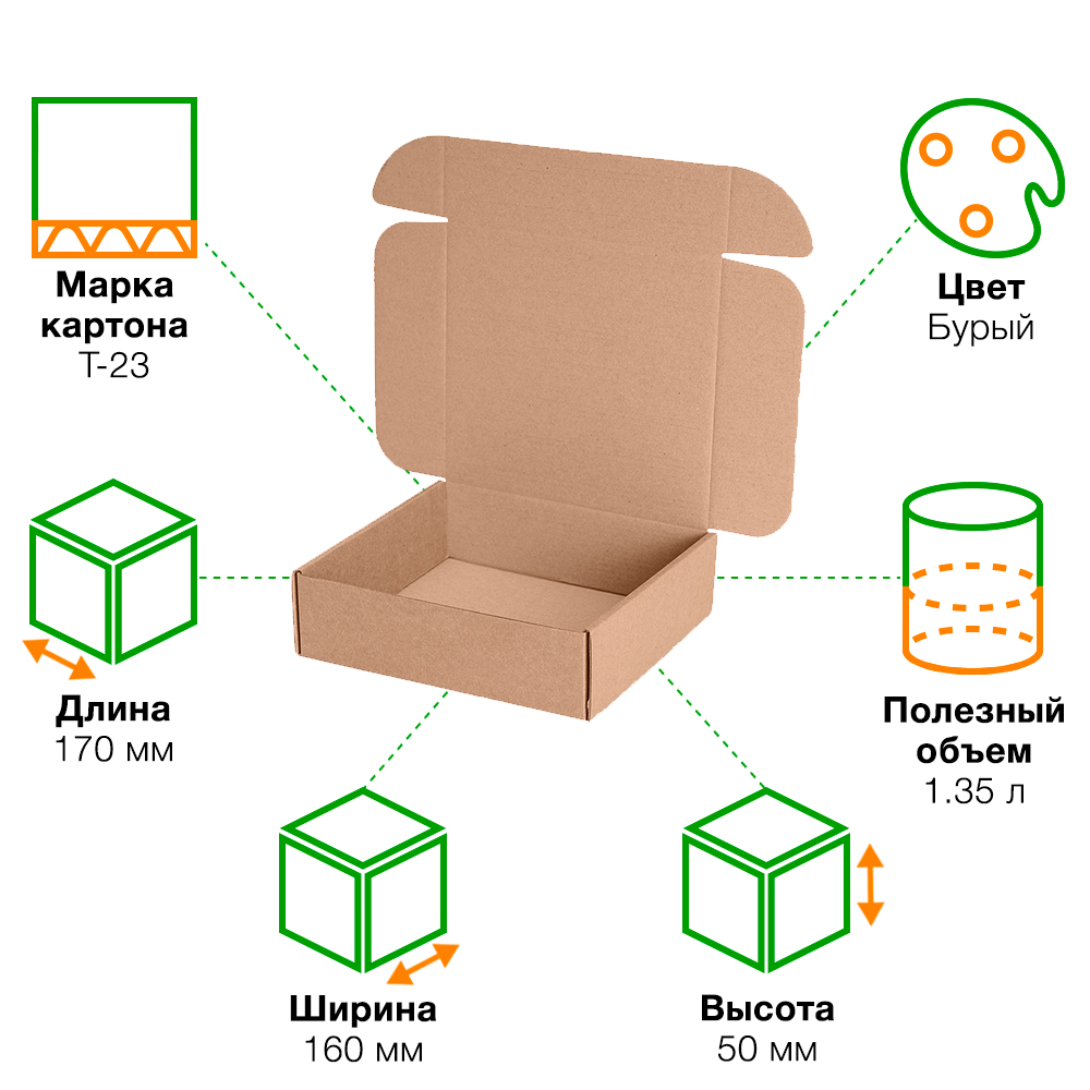Короб КС-611 МГК, серии КС-600, бурый, длиной 170 мм, шириной 160 мм и высотой 50 мм. Изготовлен из микрогофрокартона Т-23. Полезный объём — 1.35 л.