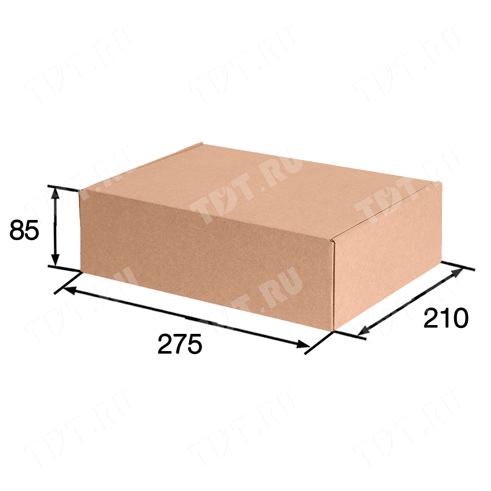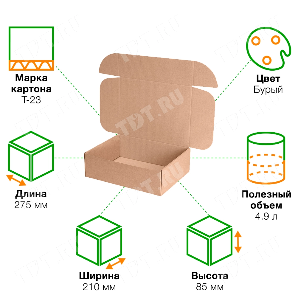 Короб КС-631 МГК, серии КС-600, бурый, длиной 275 мм, шириной 210 мм и высотой 85 мм. Изготовлен из микрогофрокартона Т-23. Полезный объём — 4.9 л.