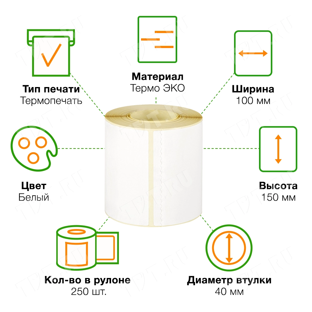 Самоклеящиеся этикетки ЭКО из матовой бумаги белого цвета, шириной 100 мм, высотой 150 мм, диаметром втулки 40 мм, количеством в рулоне по 250 штук. Производятся в России. Термоэтикетки ЭКО в рулонах предназначены для печати на принтерах без риббона. На этикетках есть специальный слой, который при нагреве термоголовки принтера темнеет, за счет этого происходит печать.