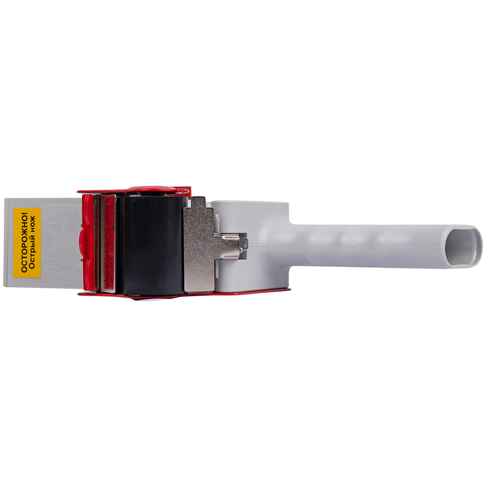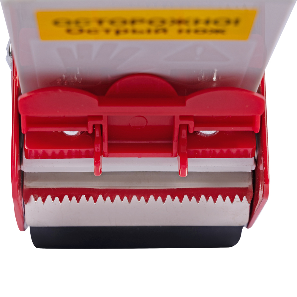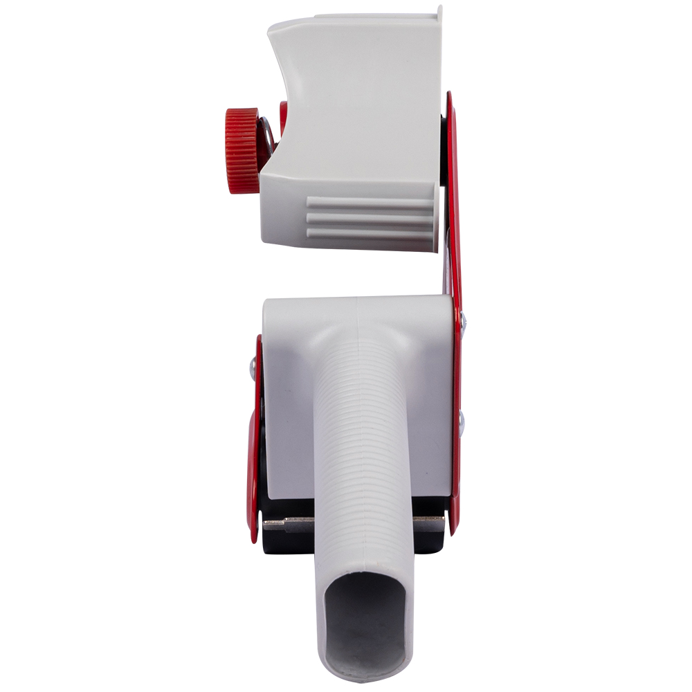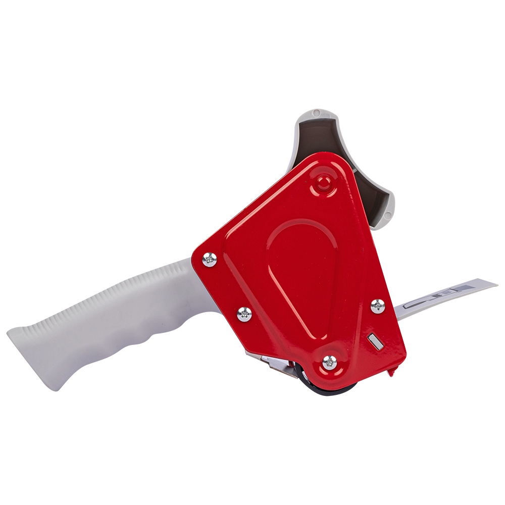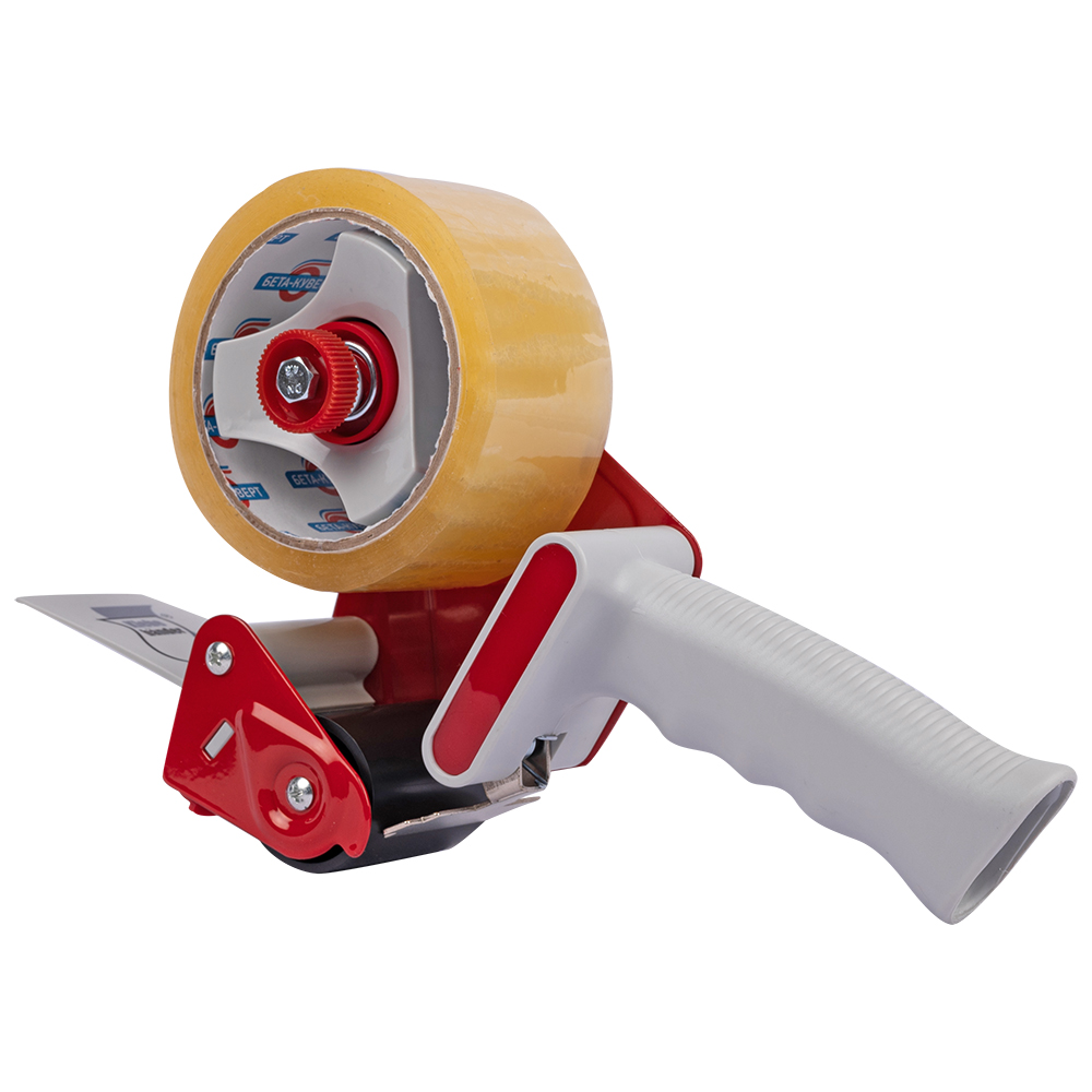 Диспенсер имеет удобную ручку и катушку, на которую крепится ролик ленты, механизм, регулирующий натяжение, и металлический нож.