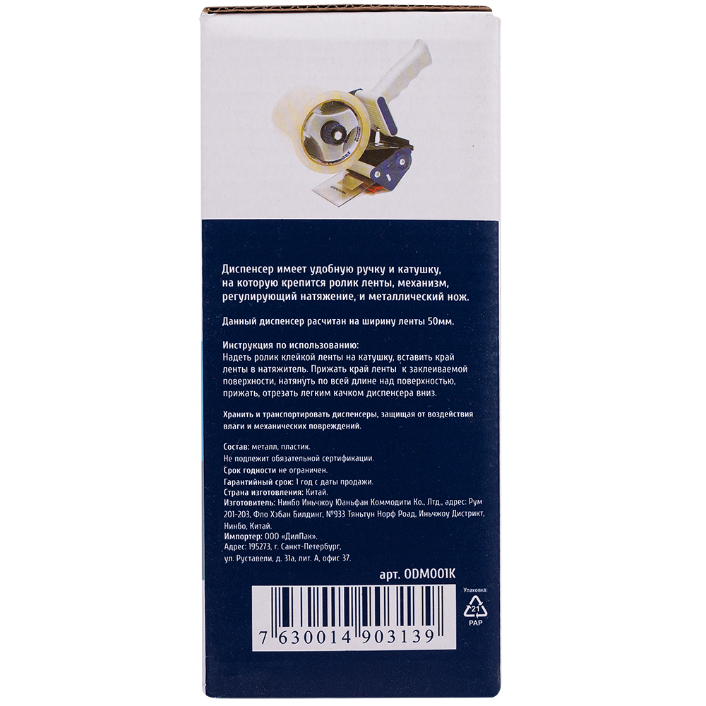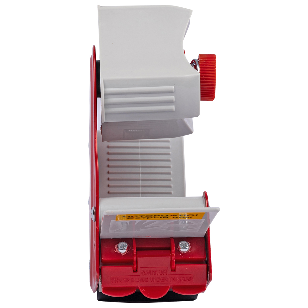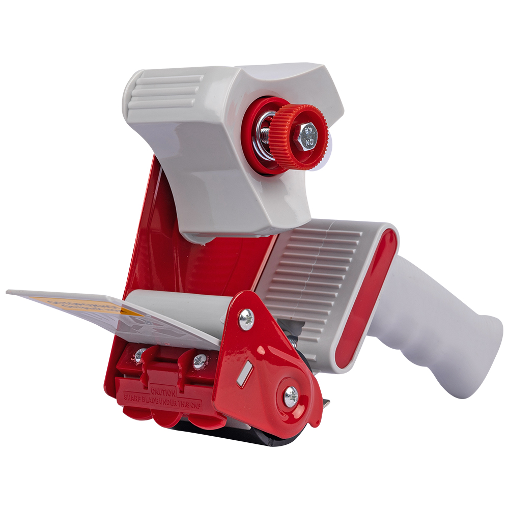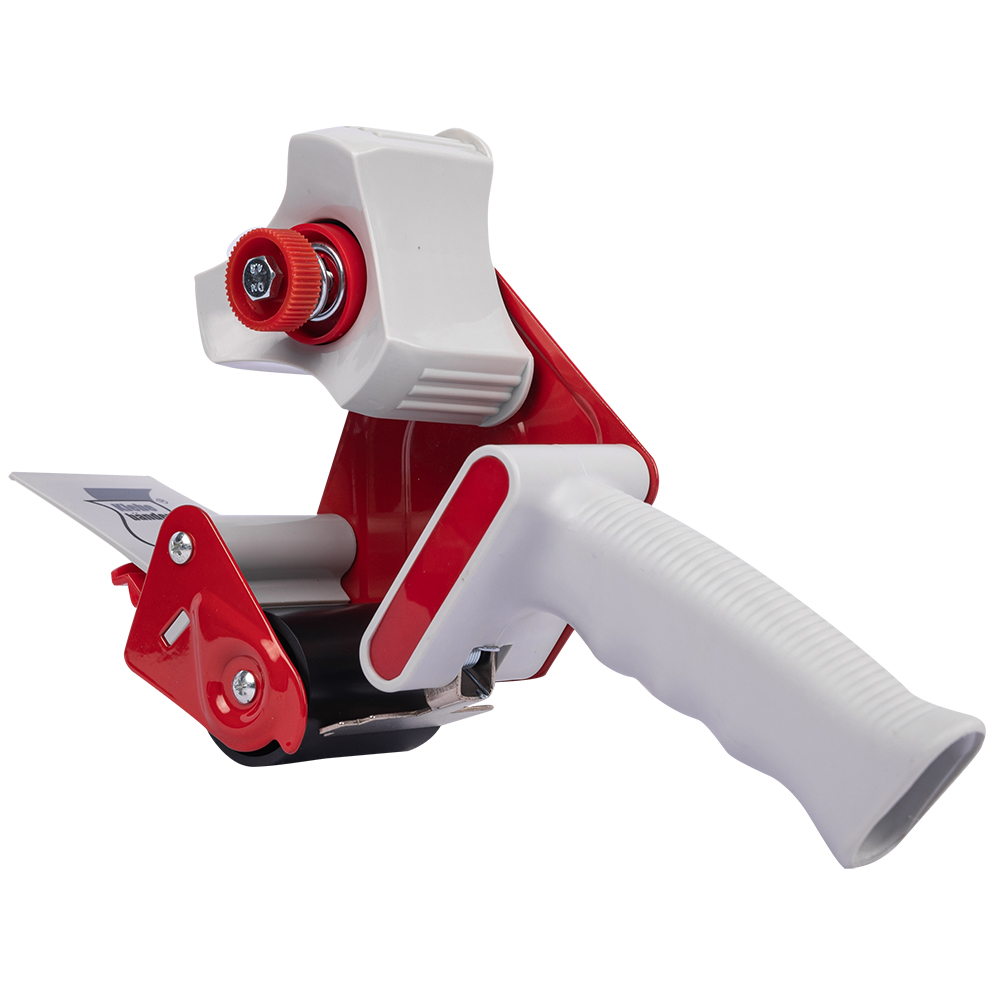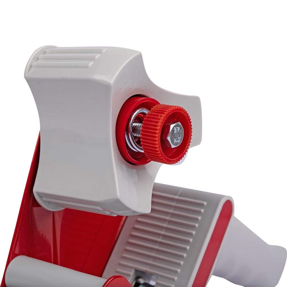 Диспенсер имеет удобную ручку и катушку, на которую крепится ролик ленты, механизм, регулирующий натяжение, и металлический нож.