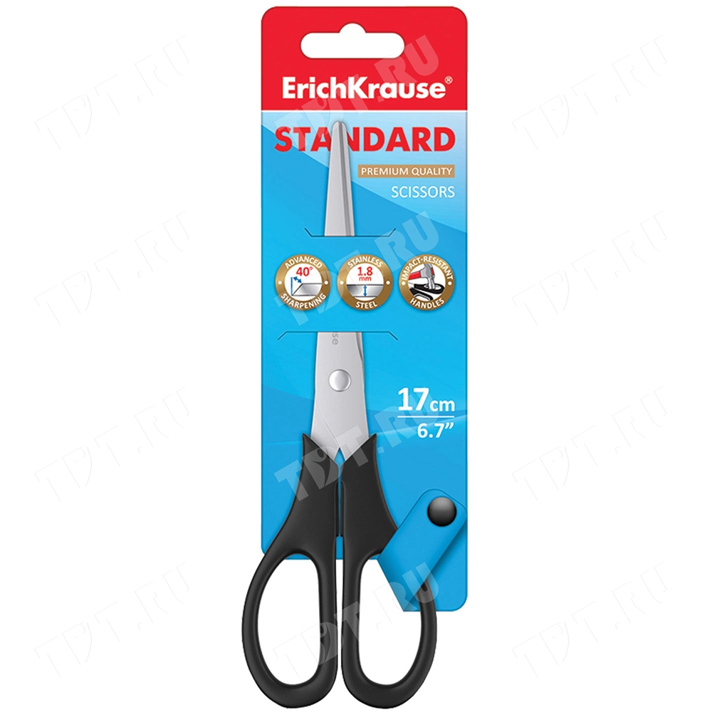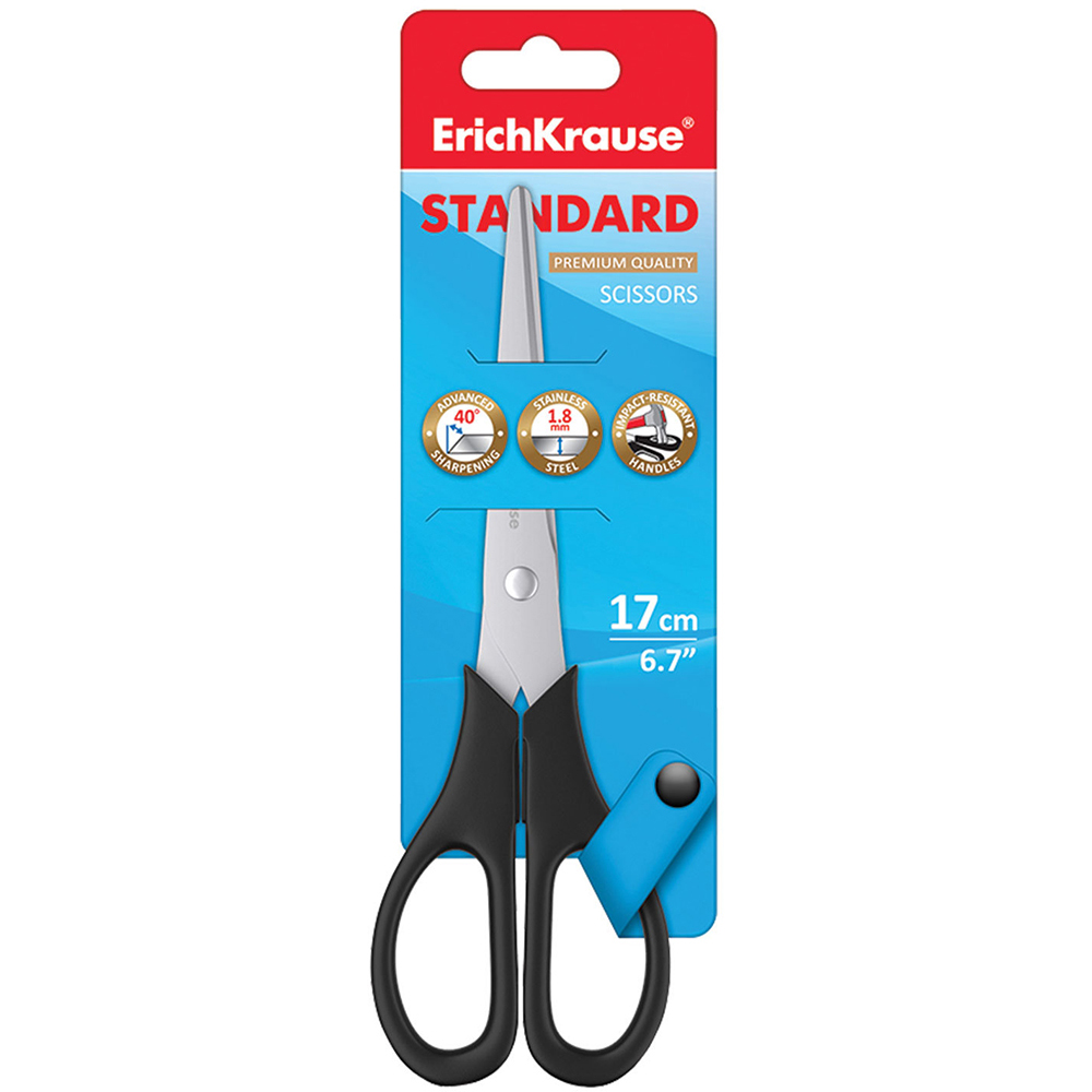 Ножницы Erich Krause «STANDARD», Premium Quality код производителя 14861, длина лезвий 170 мм, черного цвета. Материал – нержавеющая сталь и пластик. Продаются в картонной упаковке с европодвесом. Производятся в Китае.