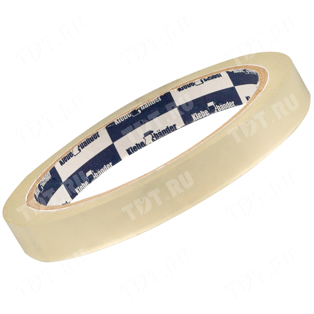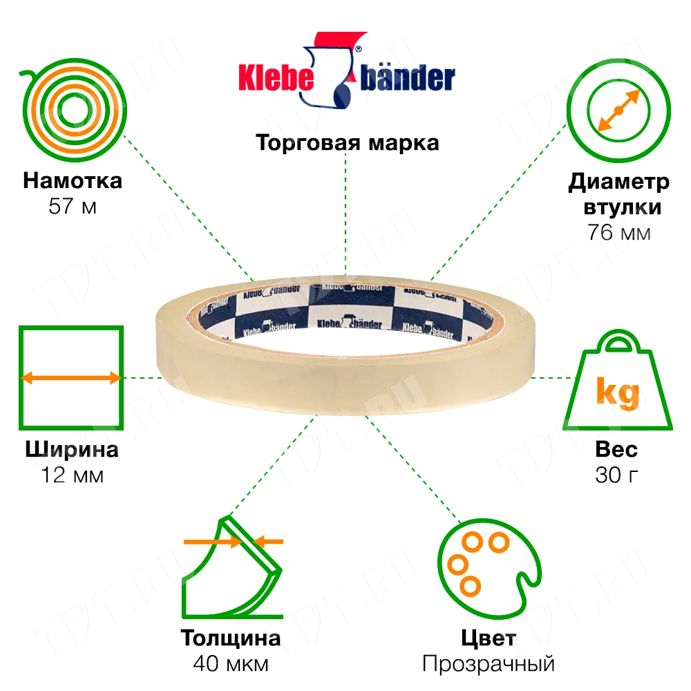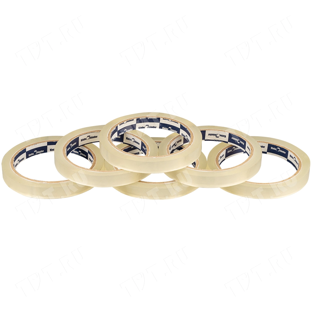 Пакетная клейкая лента прозрачная шириной 12 мм, диаметром втулки 76 мм, намоткой 57 метров для ручной упаковки Klebebander. Изготовлена на основе биаксиально ориентированной полипропиленовой пленки (БОПП).
