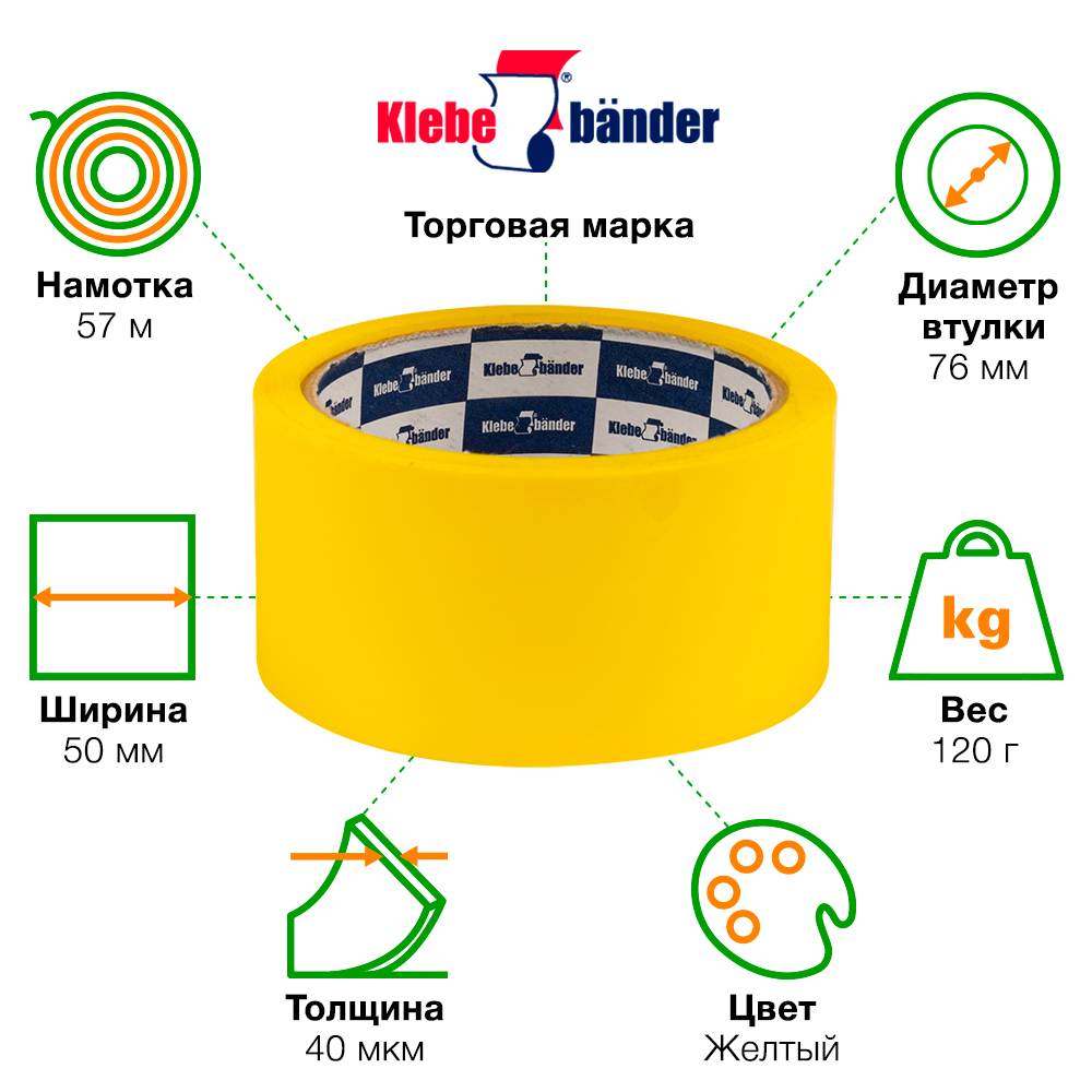 Клейкая лента желтого цвета 50 мм, намоткой 57 метров для ручной упаковки KLEBEBANDER.