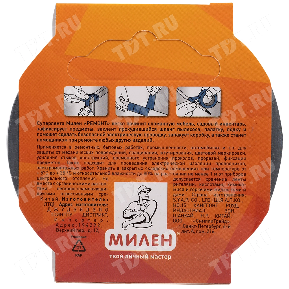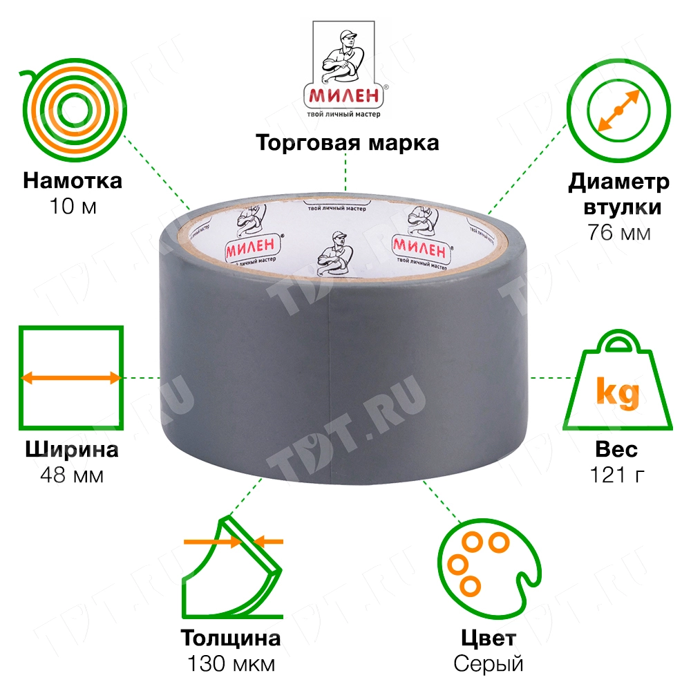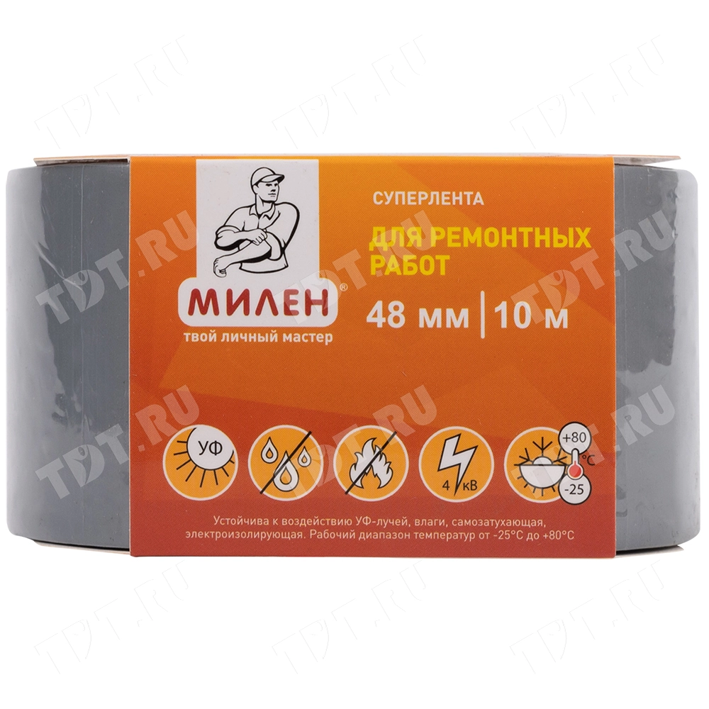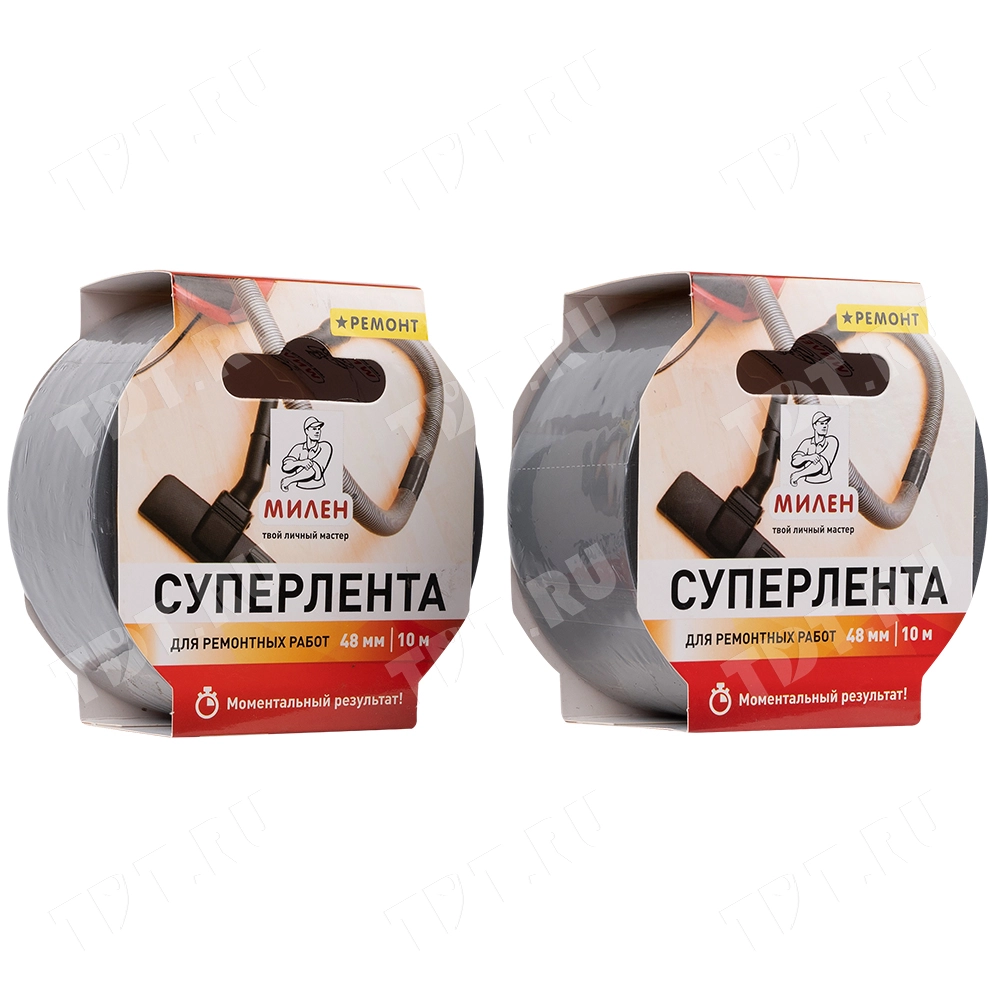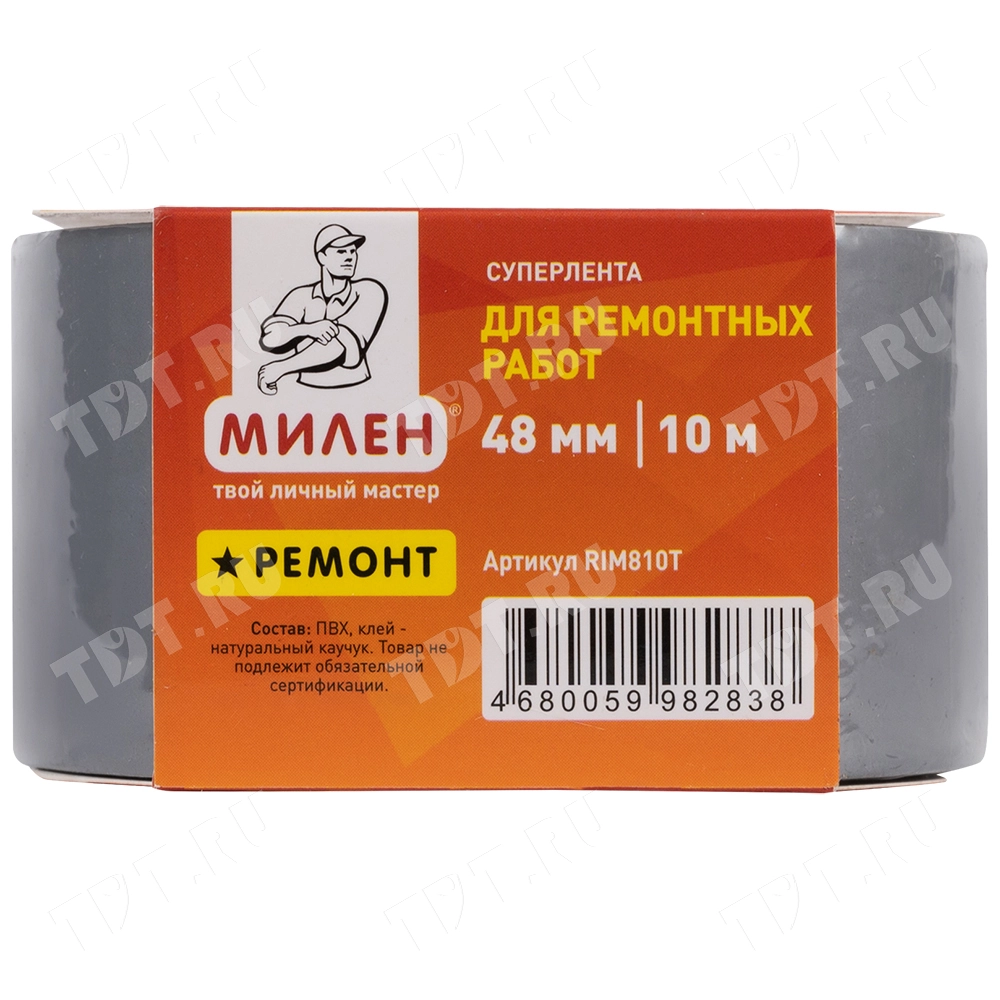 Суперлента Милен «Ремонт» шириной 48 мм, диаметром втулки 76 мм, намоткой 10 метров. Изготовлена на основе поливинилхлорида (ПВХ).