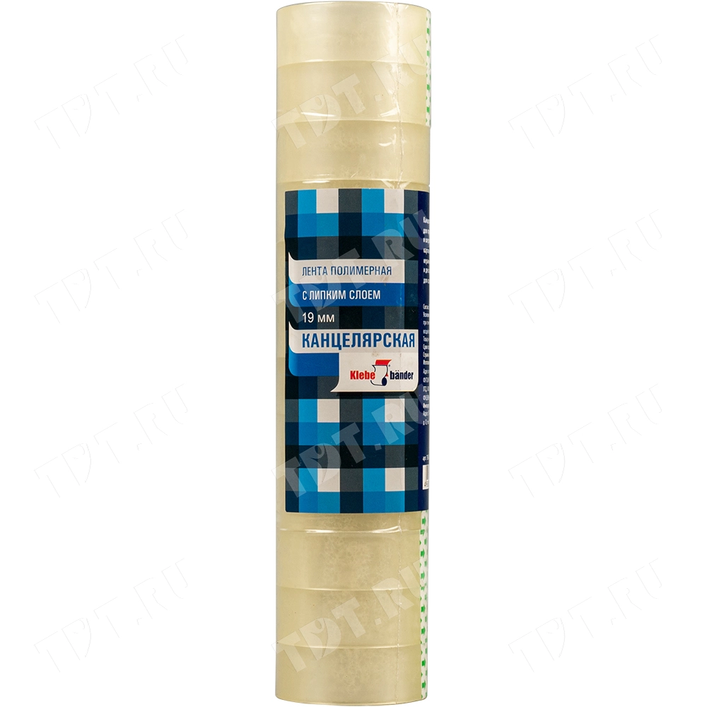 Канцелярская прозрачная клейкая лента Klebebander шириной 19 мм, диаметром втулки 25 мм, намоткой 28 метров. Изготовлена на основе биаксиально ориентированной полипропиленовой пленки (БОПП).