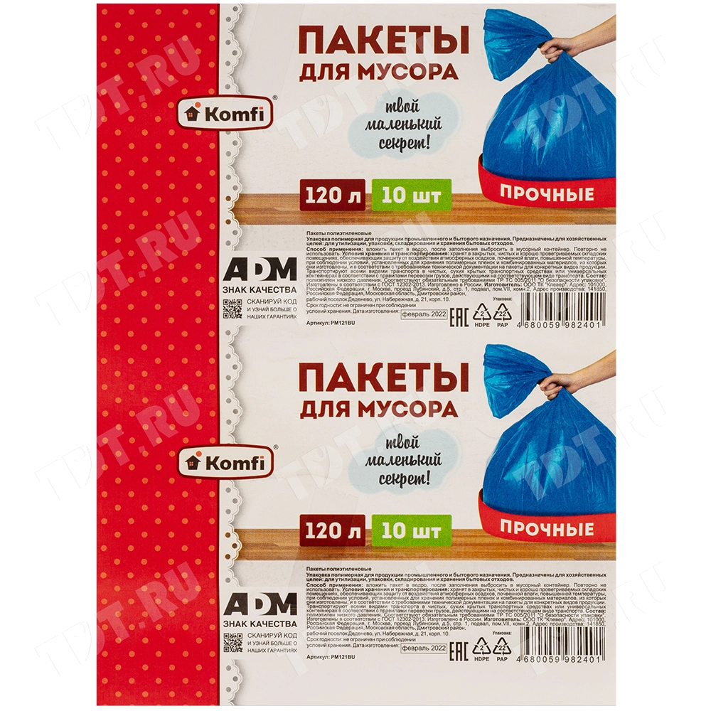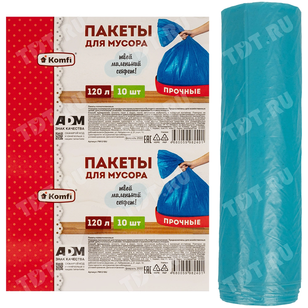 Мешки для мусора Komfi ПНД, код производителя 17176, голубого цвета, объемом 120 л, длиной 100 см, шириной 70 см, толщиной 14 мкм, в упаковке по 10 штук. Изготовлены из полиэтилена низкого давления (ПНД).