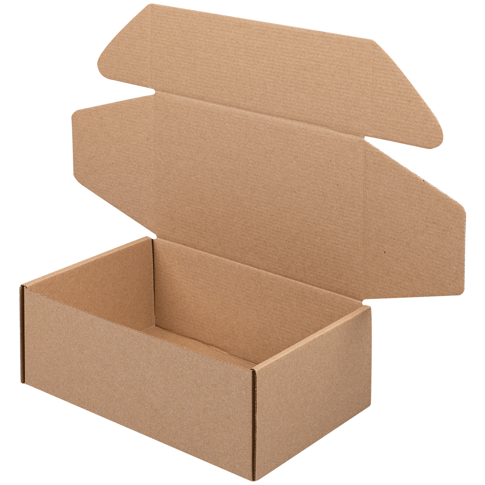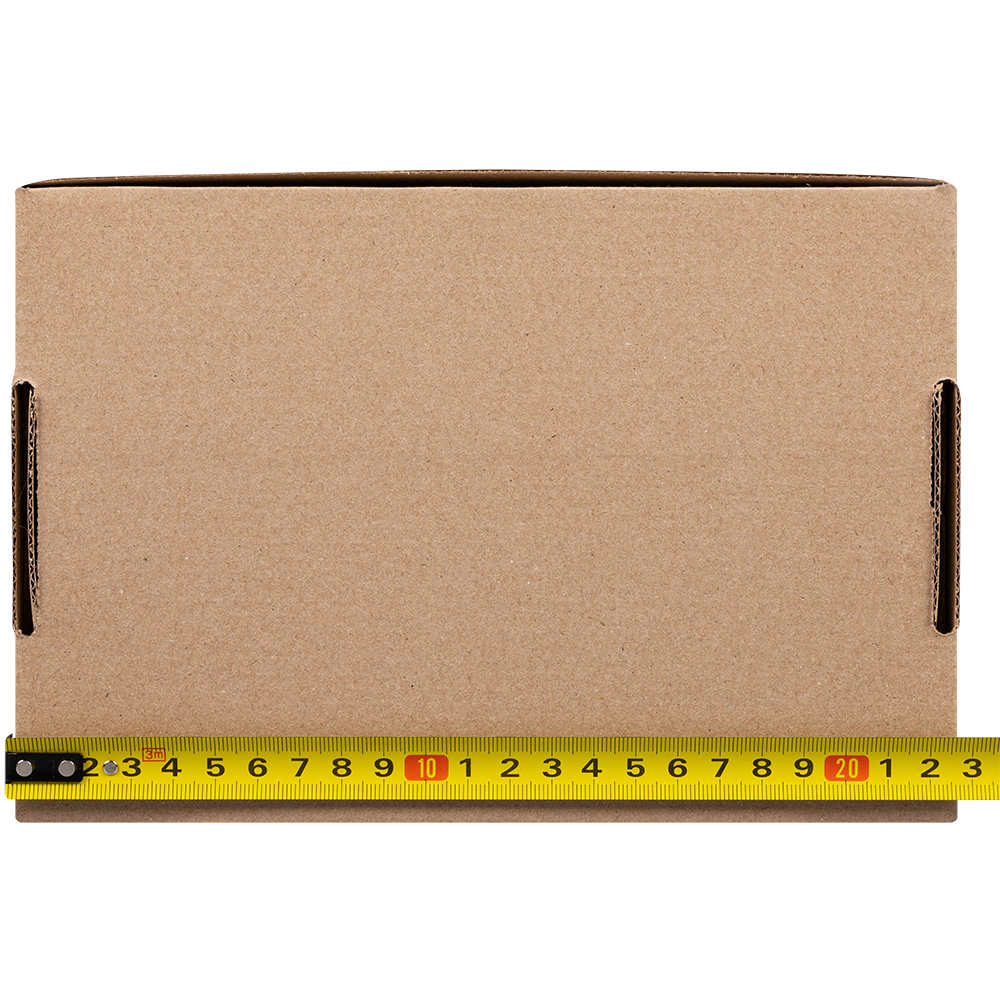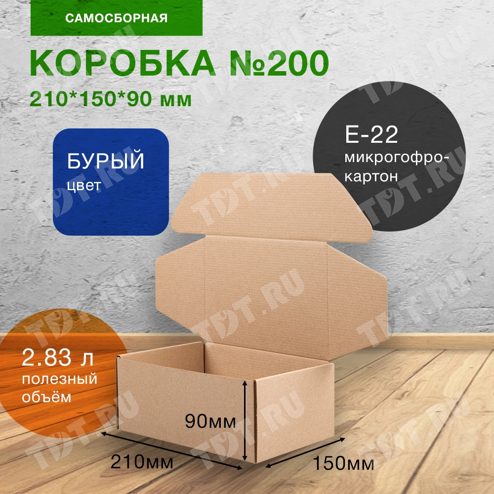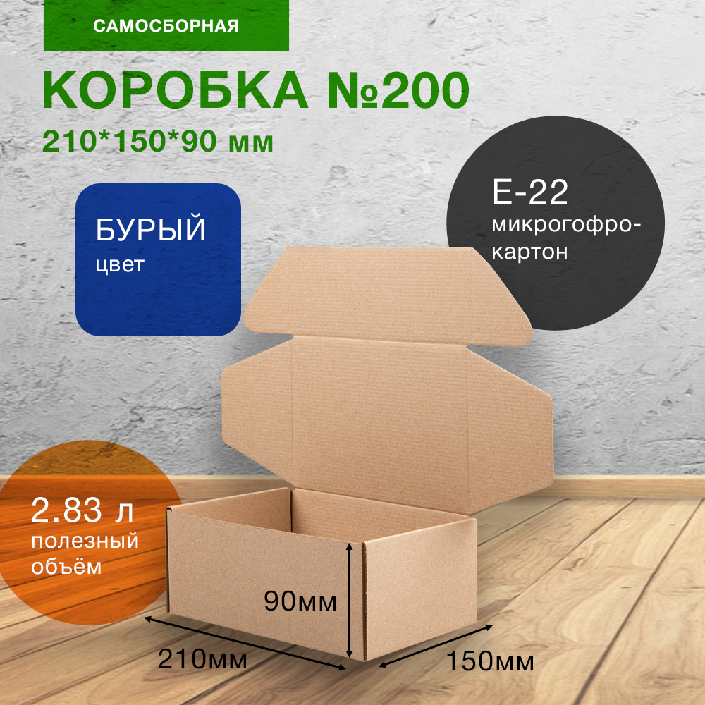 Короб №200 (премиум) бурого цвета, длиной 210 мм, шириной 150 мм и высотой 90 мм. Изготовлен из микрогофрокартона Е-22. Полезный объём — 2.83 л.