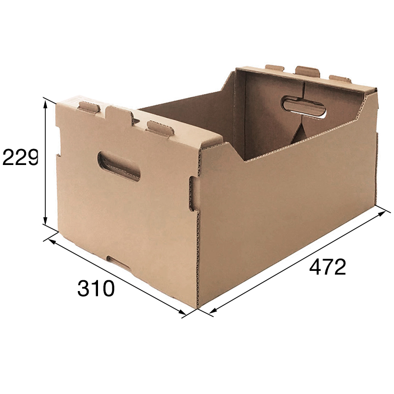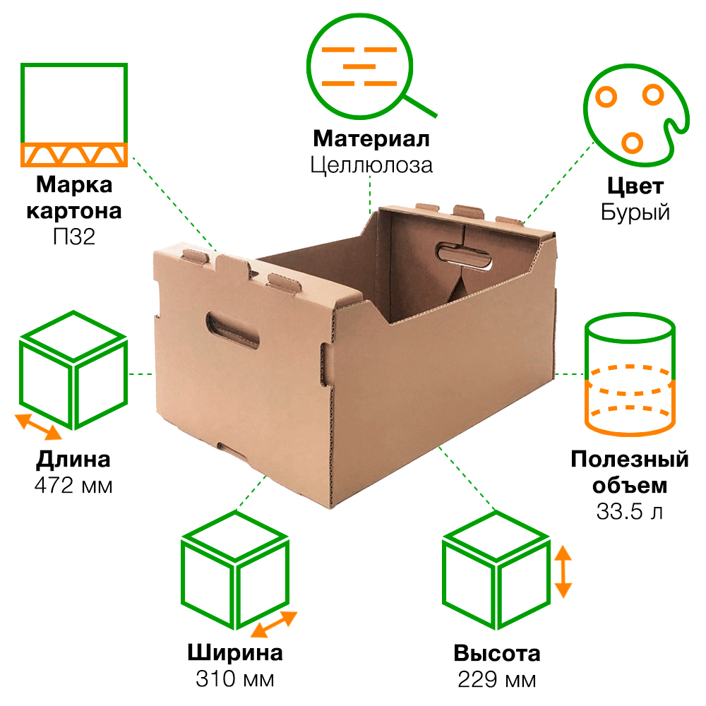 Гофролоток №1 для овощей и фруктов, бурого цвета, длиной 472 мм, шириной 310 мм и высотой 229 мм. Изготовлен из пятислойного картона марки П-32. Полезный объём — 33.5 л.