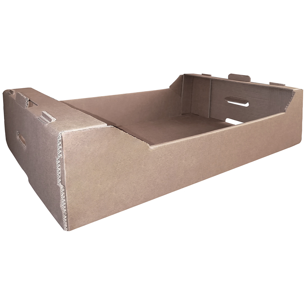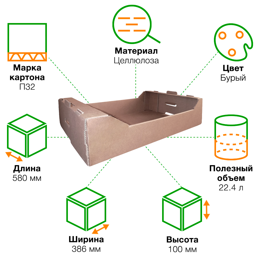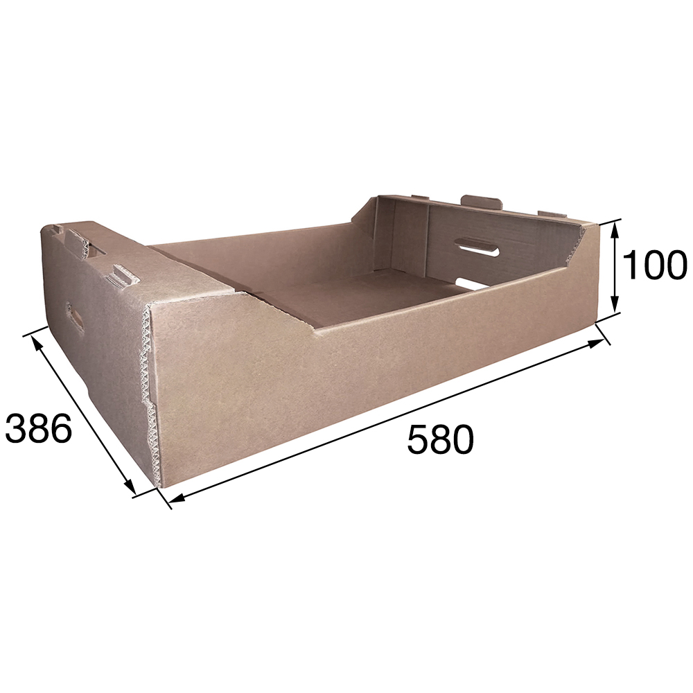 Гофролоток №2 для овощей и фруктов, бурого цвета, длиной 580 мм, шириной 386 мм и высотой 100 мм. Изготовлен из пятислойного картона марки П-32. Полезный объём — 22.4 л.