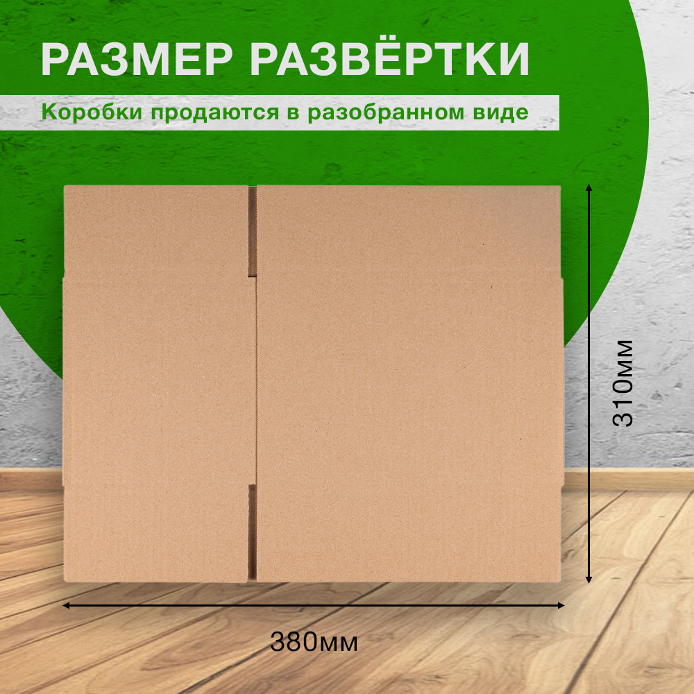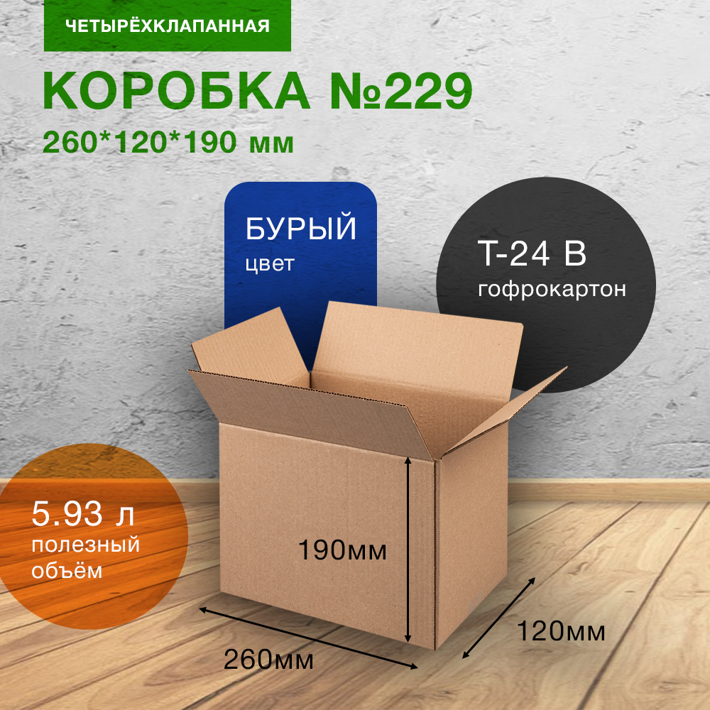 Короб №229 бурого цвета, длиной 260 мм, шириной 120 мм и высотой 190 мм. Изготовлен из трехслойного картона марки Т-24 В. Полезный объём — 5.93 л.