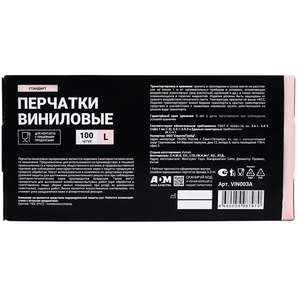Одноразовые виниловые перчатки A.D.M., размер L, белого цвета, неопудренные, нестерильные, в упаковке по 100 шт. Предназначены для защиты рук при уборке, приготовлении пищи, косметических процедурах. Материал – поливинилхлорид. Производятся в Китае.