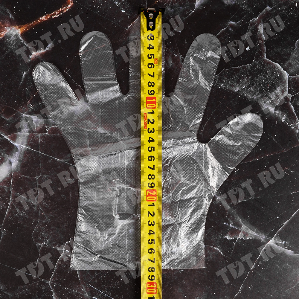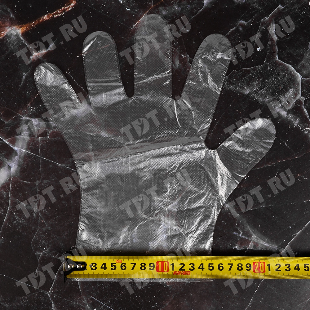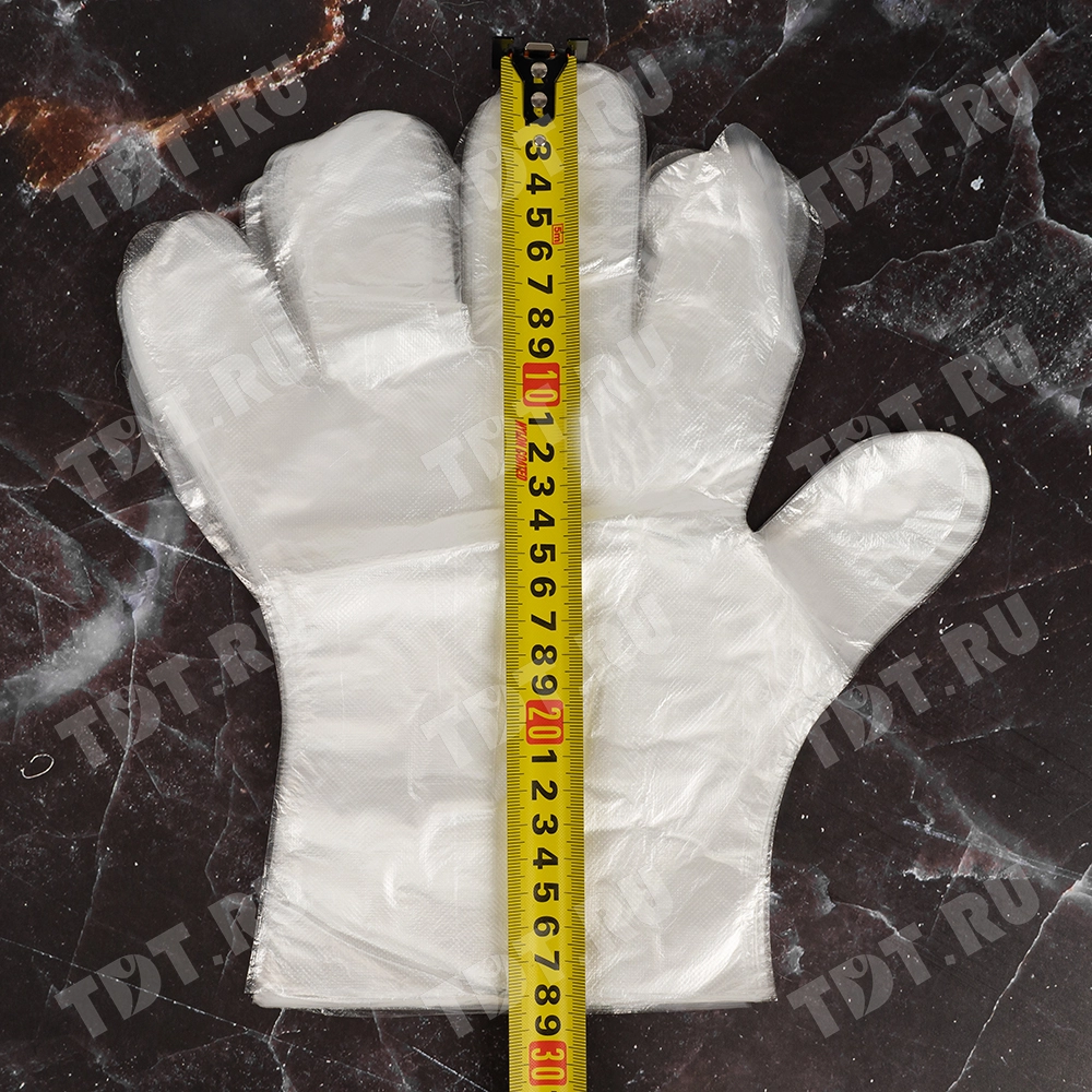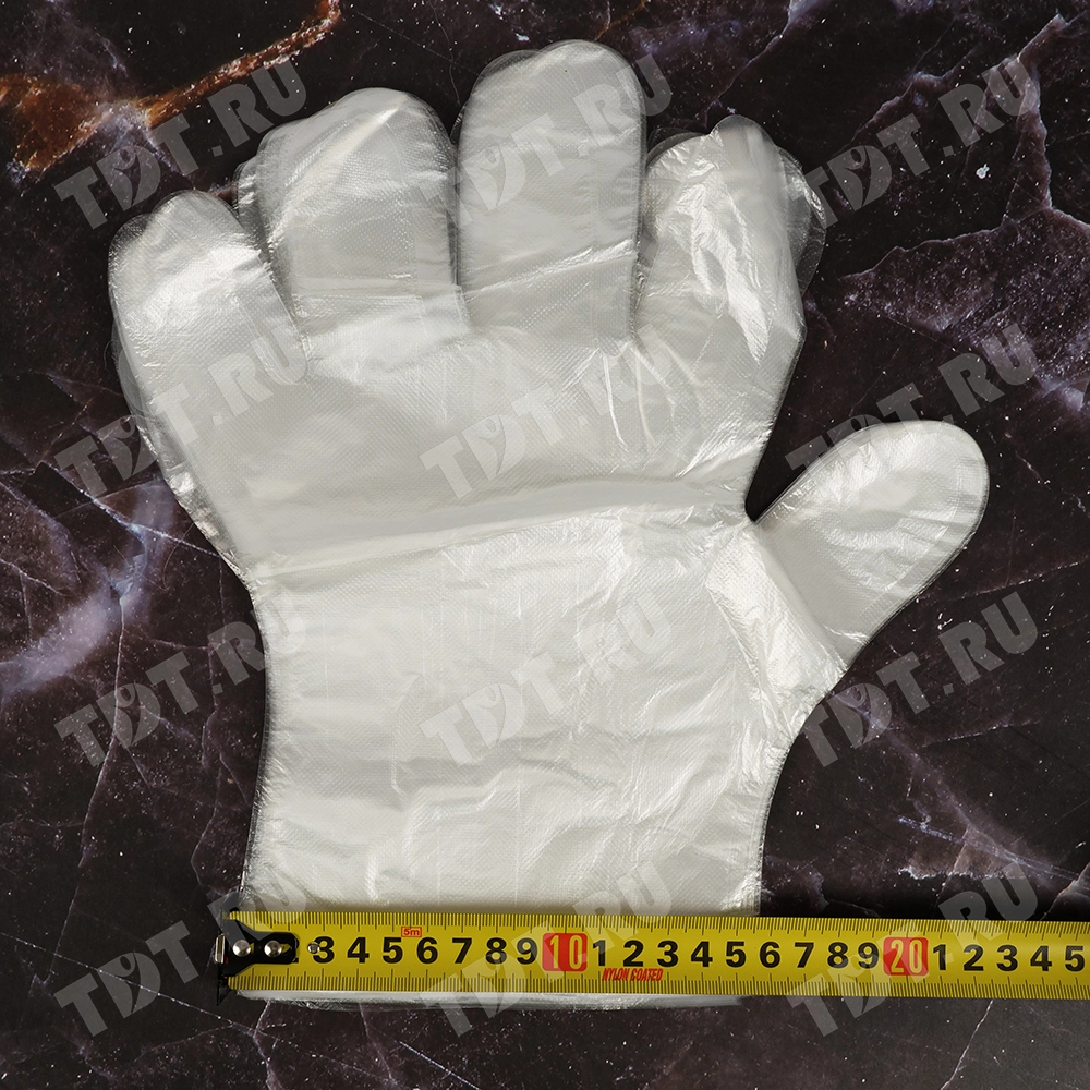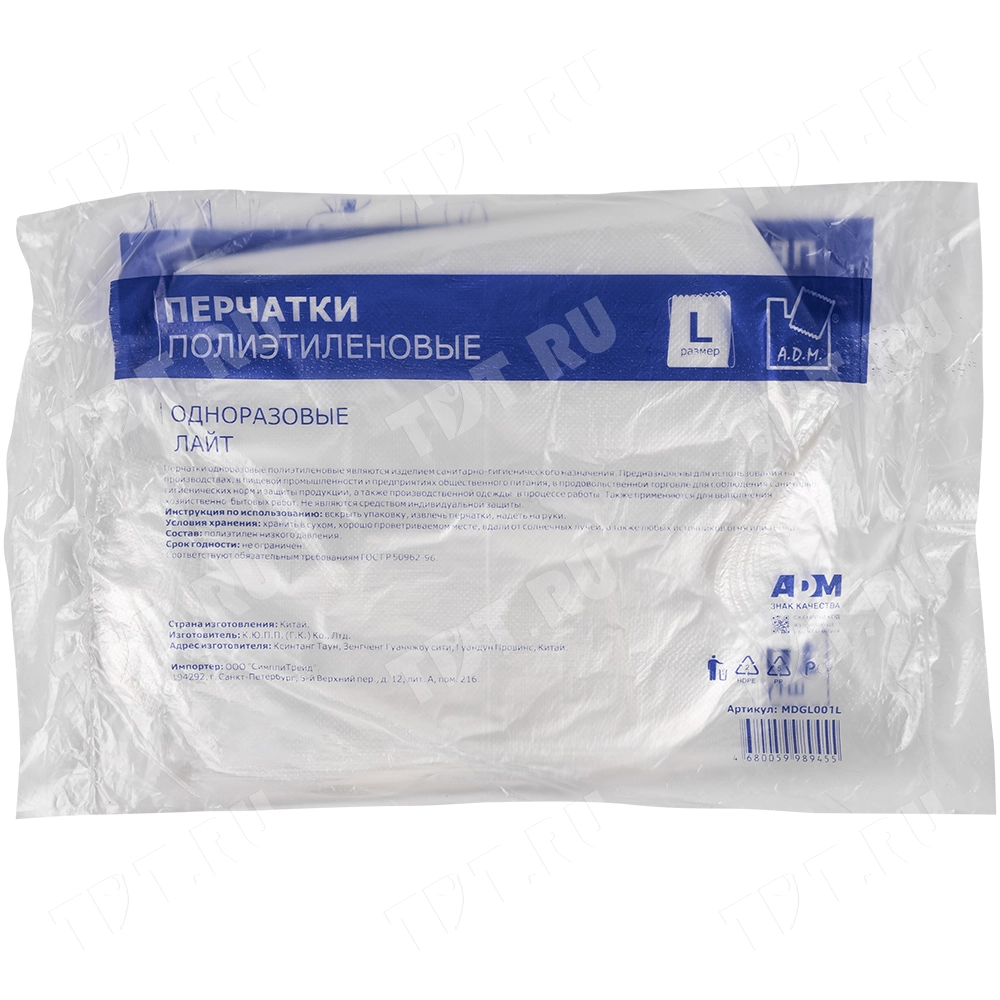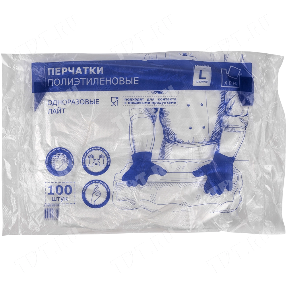 Одноразовые полиэтиленовые перчатки A.D.M., Лайт, размера L, неопудренные, прозрачного цвета, в упаковке по 100 штук. Материал – 100% полиэтилен. Производятся в Китае.