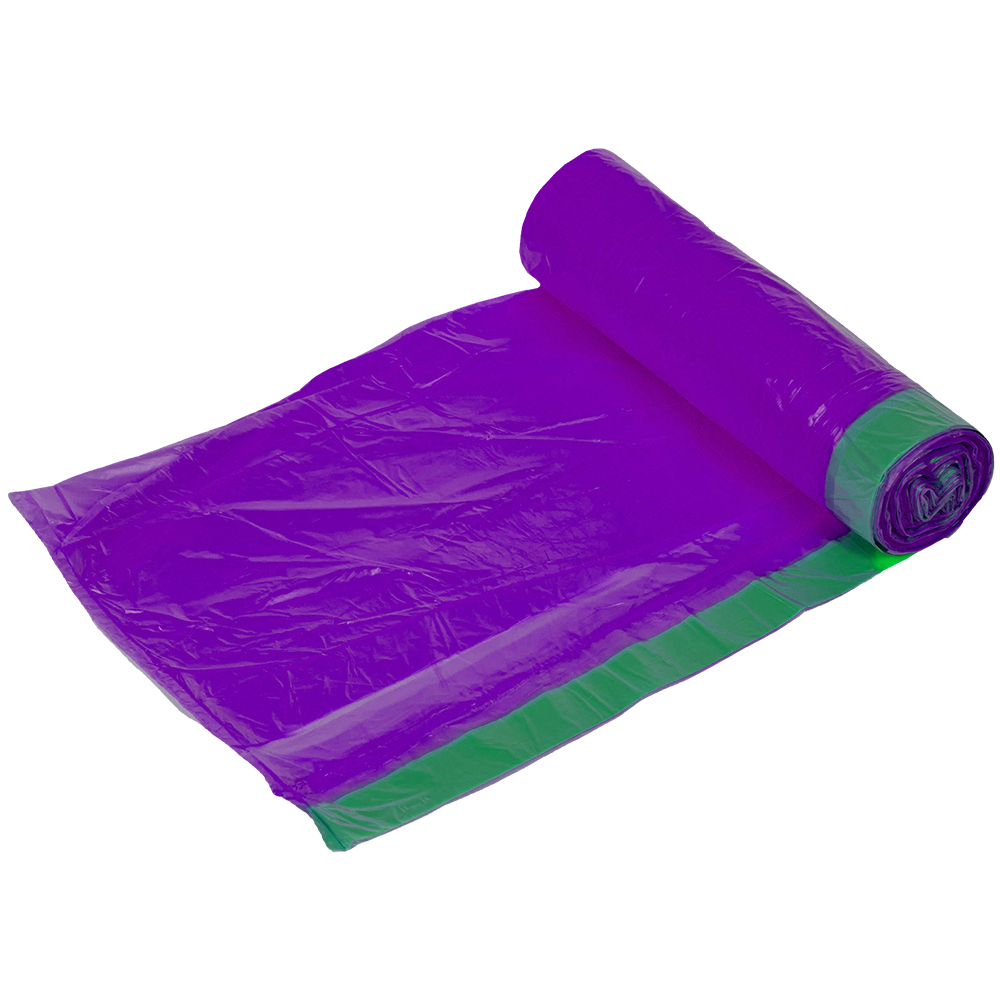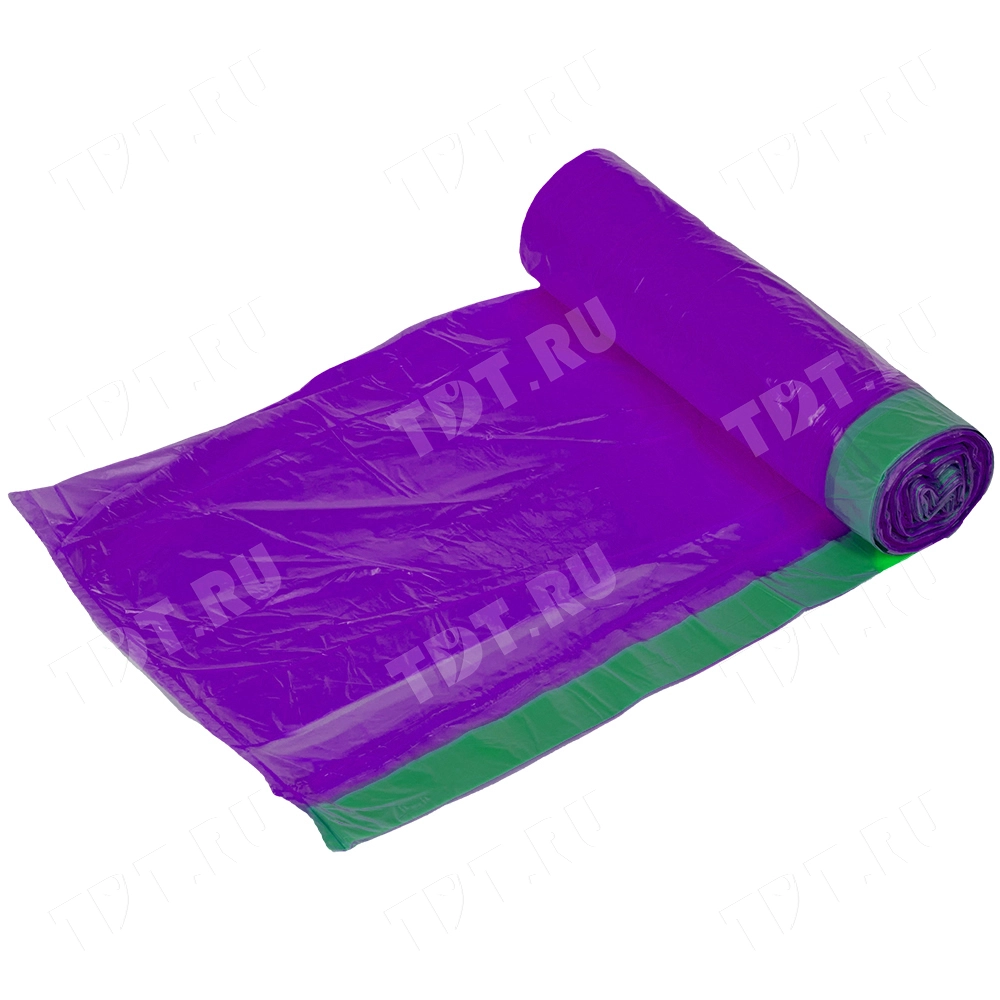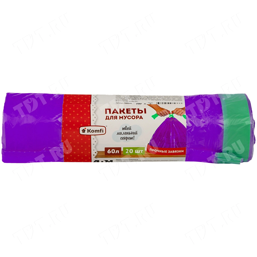 Мешки для мусора Komfi ПНД с прочными завязками, код производителя 30472, фиолетового цвета, объемом 60 л, длиной 68 см, шириной 58 см, толщиной 11 мкм, в упаковке по 20 штук. Выдерживают вес груза до 10.5 кг. Изготовлены из полиэтилена низкого давления (ПНД).
