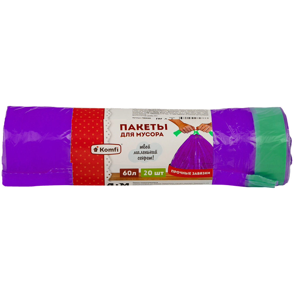 Мешки для мусора ПНД Komfi 60 литров с завязками, 58*68 см, фиолетовые, 20 шт./рулон