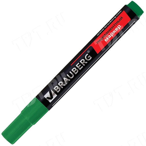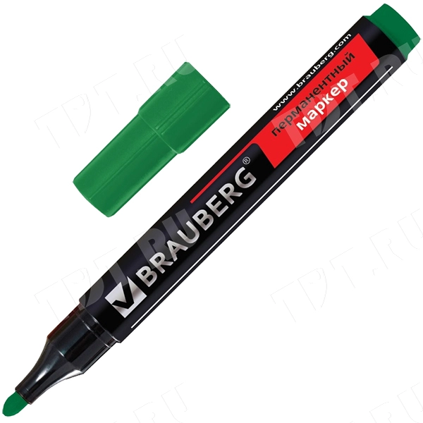 Маркер перманентный BRAUBERG, спиртовой, толщиной пера 3 мм, зелёного цвета, круглый наконечник, код производителя 150468. Производится в Китае.
