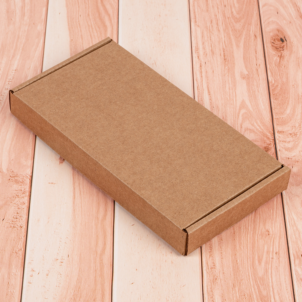 Коробка под чехол для телефона бурого цвета, длиной 180 мм, шириной 90 мм и высотой 20 мм.
