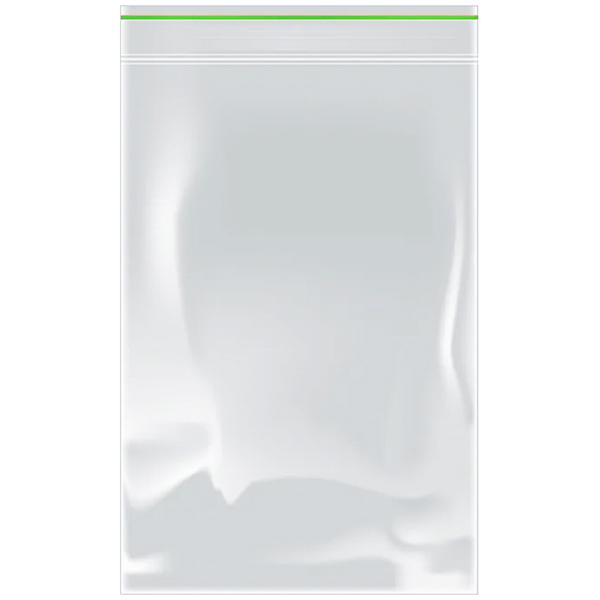 Пакеты Zip-Lock, прозрачного цвета с зеленой полосой, длиной 150 мм, шириной 100 мм, толщиной 23-26 мкм, в упаковке по 100 штук. Материал – полиэтилен высокого давления (ПВД). Производятся в Китае.