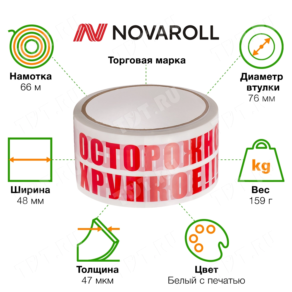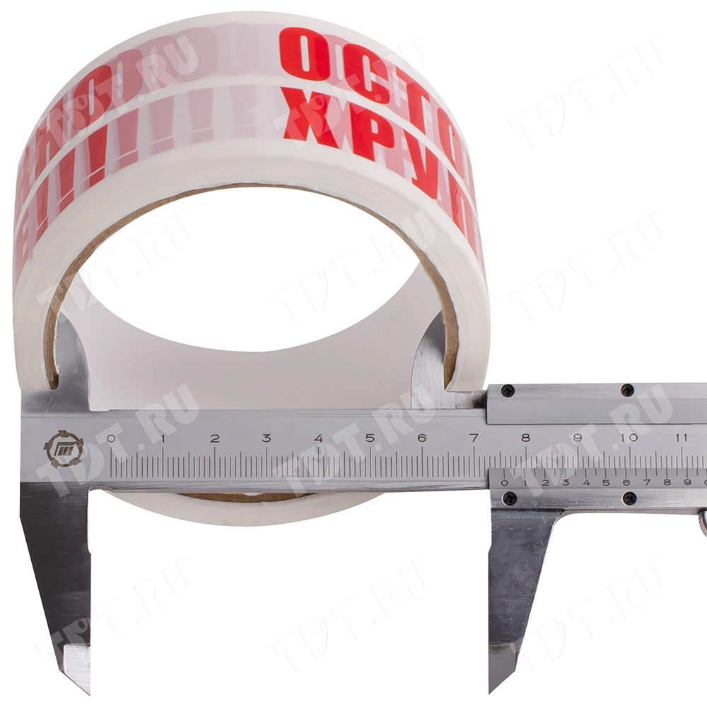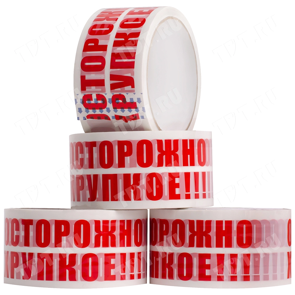 Белая клейкая лента с красной надписью «Осторожно хрупкое» шириной 48 мм, толщиной 47 мкм, диаметром втулки 76 мм, намоткой 66 метров. Изготовлена на основе полипропилена.