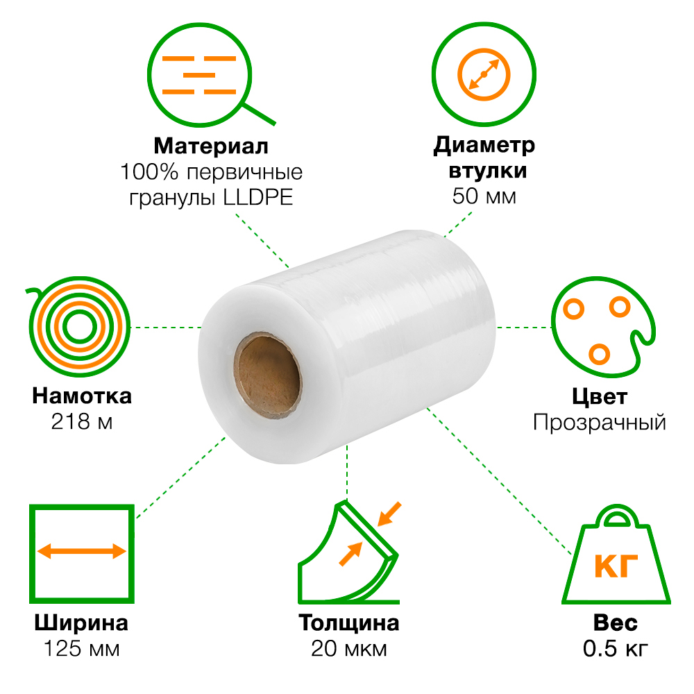 Прозрачная стрейч пленка микро-ролик, первого сорта, намоткой 218 м, шириной 125 мм, толщиной 20 мкм. Изготовлена из первичных гранул LLDPE. Собственное производство — ПолимерНова.