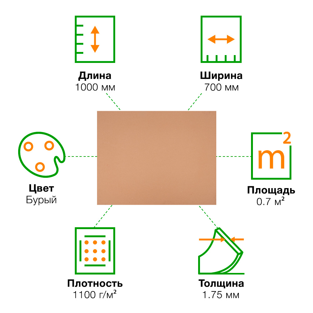 Переплетный картон, бурого цвета, длиной 1000 мм, шириной 700 мм, толщиной 1.75 мм, плотностью 1100 г/м², площадью 0.7 м². Материал – высококачественный картон. Производится в России.