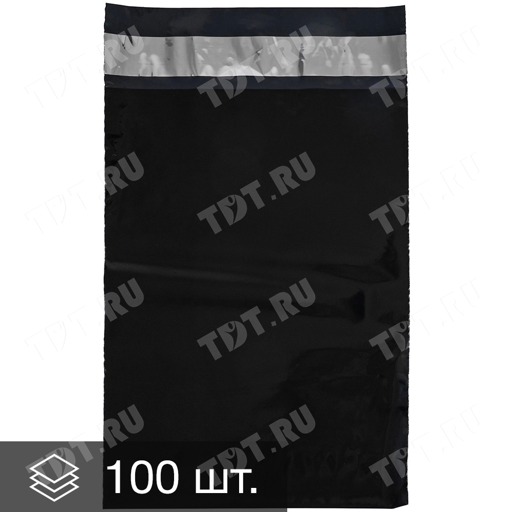 Чёрный курьер-пакет без кармана, без печати, длиной 240+40 мм, шириной 170 мм, толщиной 50 мкм. В упаковке 100 штук.