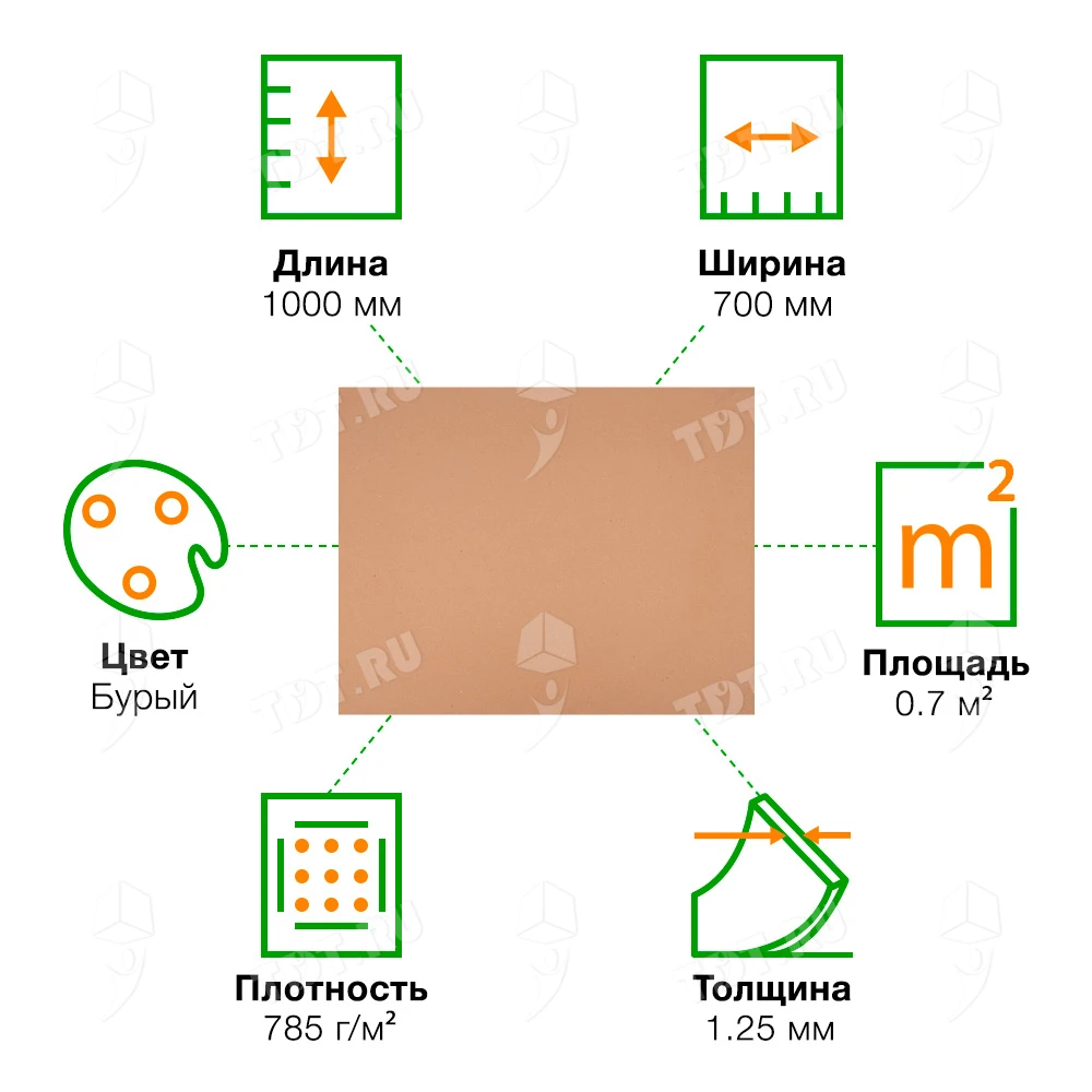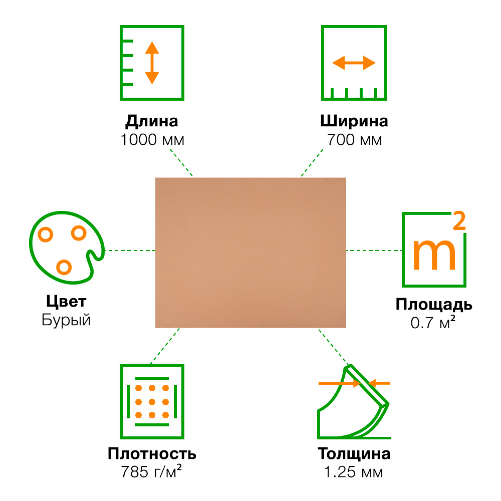 Переплетный картон, бурого цвета, длиной 1000 мм, шириной 700 мм, толщиной 1.25 мм, плотностью 785 г/м², площадью 0.7 м². Материал – высококачественный картон. Производится в России.