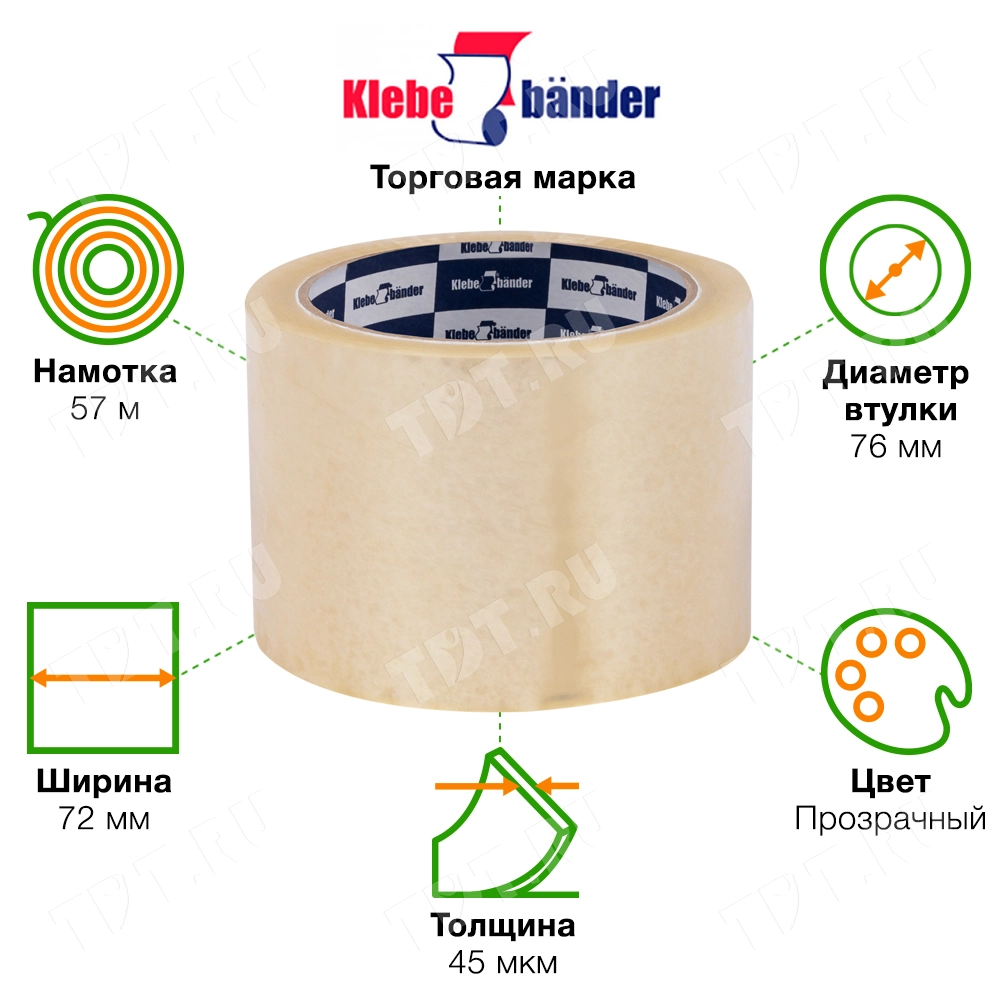 Широкая клейкая лента Klebebander прозрачная шириной 72 мм, диаметром втулки 76 мм, намоткой 57 метров, толщиной 45 мкм для ручной упаковки. Изготовлена на основе биосноориентированного полипропилена.